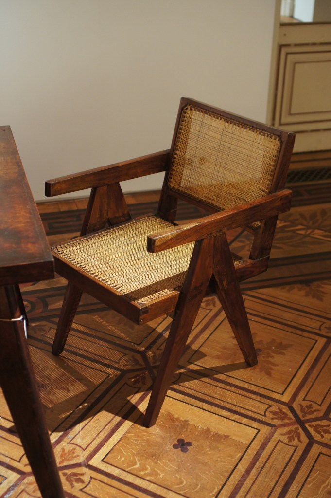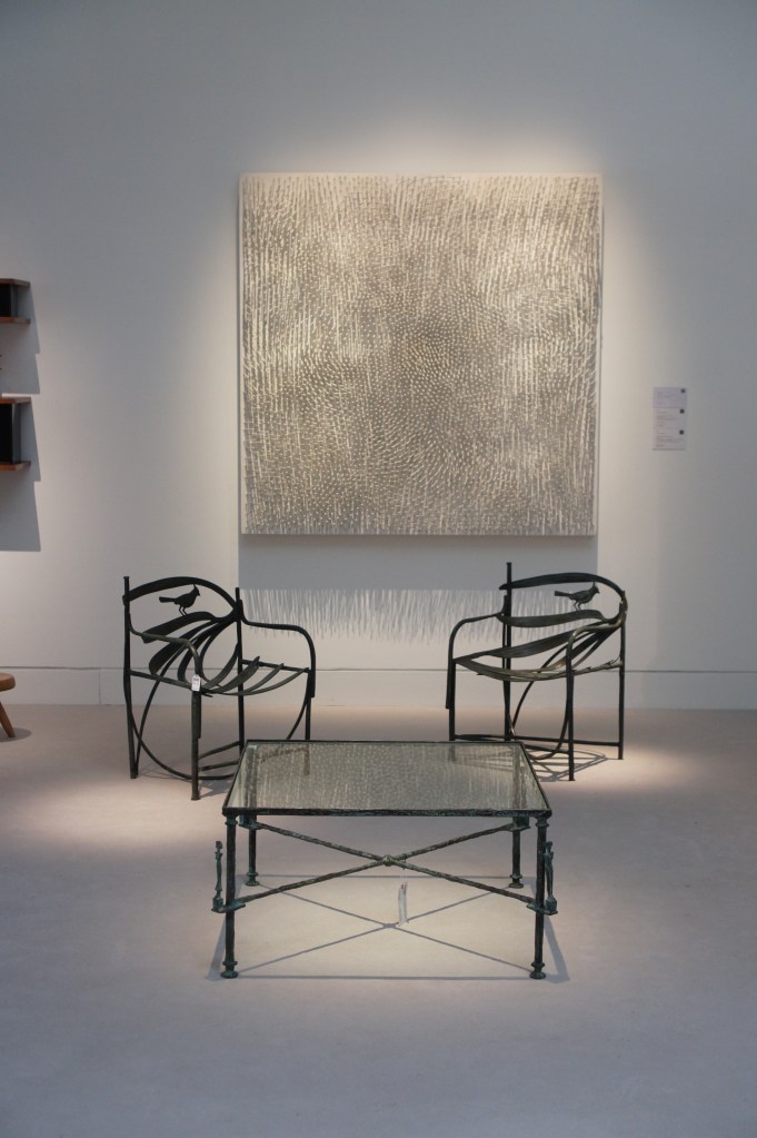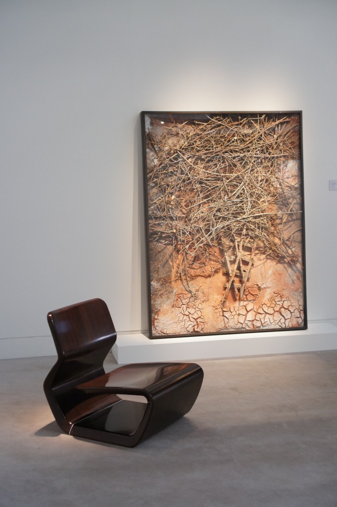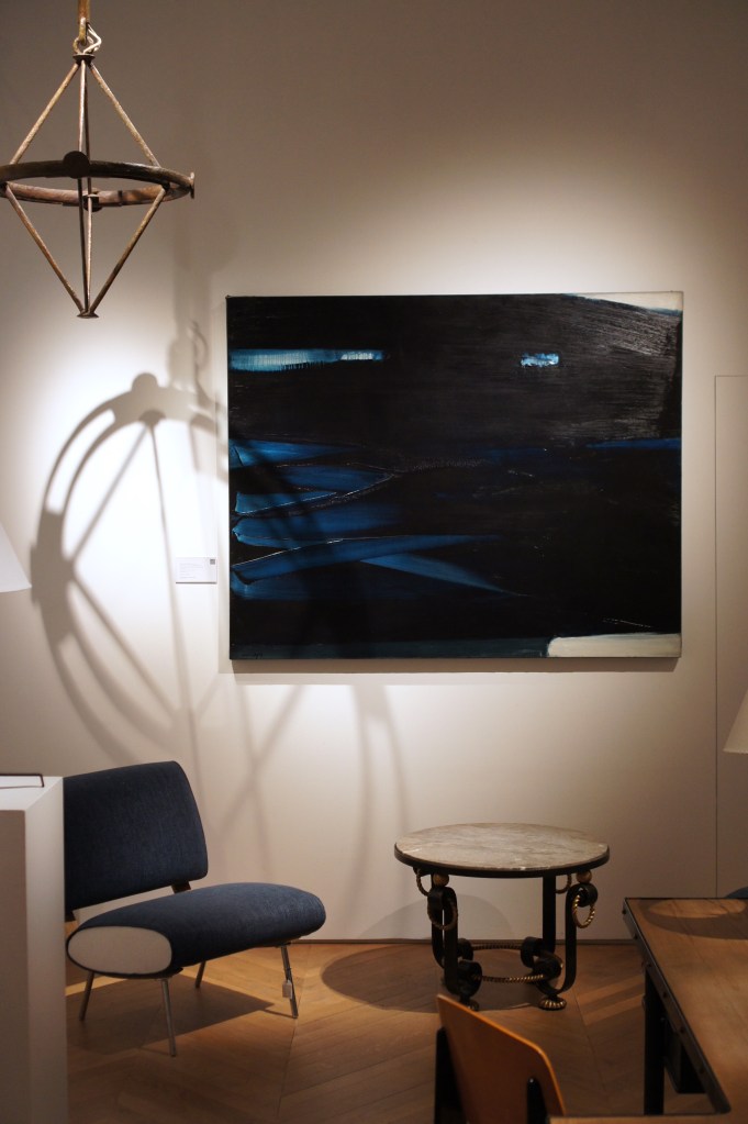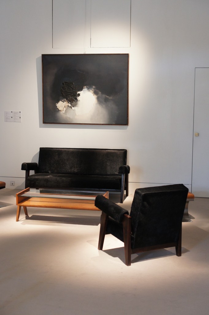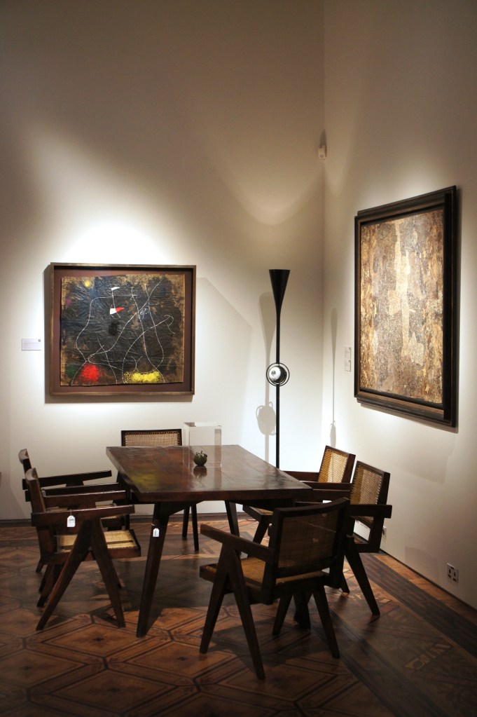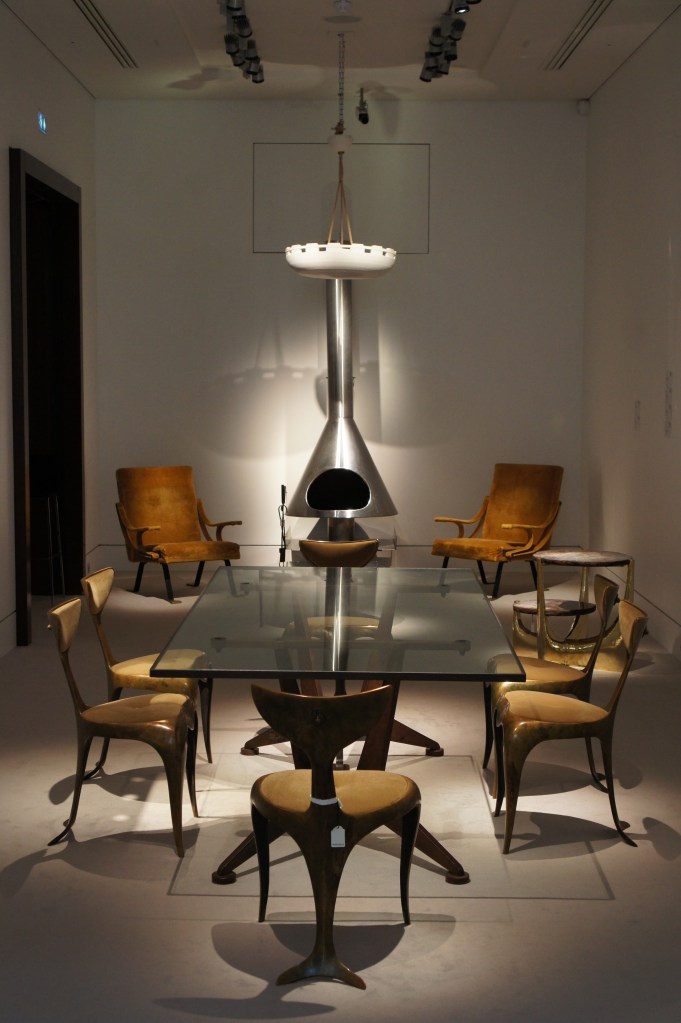 Clockwise: Ca. 1995 Montre Pomme, Claude Lalanne ; 1955-56PJ-SI-28-B chair known as Office chair, Pierre Jeanneret ; Ca. 1960-61 PJ-TA-01-A table and 1955-56PJ-SI-28-B chairs know as Office chairs, Pierre Jeanneret ; 1960 ‘La Chanteuse d’opéra’, Joan MiróOn the left: Ca. 1954 pair of 852 armchairs, Gio Ponti ; Ca. 1945 low table, Gilbert Poillerat ; ‘Peinture 130 x 162 cm, 16 novembre 1965’, Pierre Soulages ; On the right: 2006 Wingless Micarta chair, Marc Newson ; 2007 ‘Hercules am Scheideweg (Herakles at the crossroads)’, Anselm Kiefer Ca. 1990-95Dolphin tail chairs, Mark Brazier Jones ; Ca. 2000 Dining table, Tom Dixon ; Cheminée (1970), Vera Székely ; Paire de fauteuils Digamma (1957), Ignazio GardellaOn the left: 2012 Quille table, Philippe Hiquily ; Echassier lamp (designed ca. 1994), François-Xavier Lalanne ; On the right: Ca. 1955-56 canapé LC/PJ-SI-42-B and LC/PJ-SI-41-A armchair, Le Corbusier and Pierre Jeanneret ; ‘Pintura 139’ (1959), Luis Feito