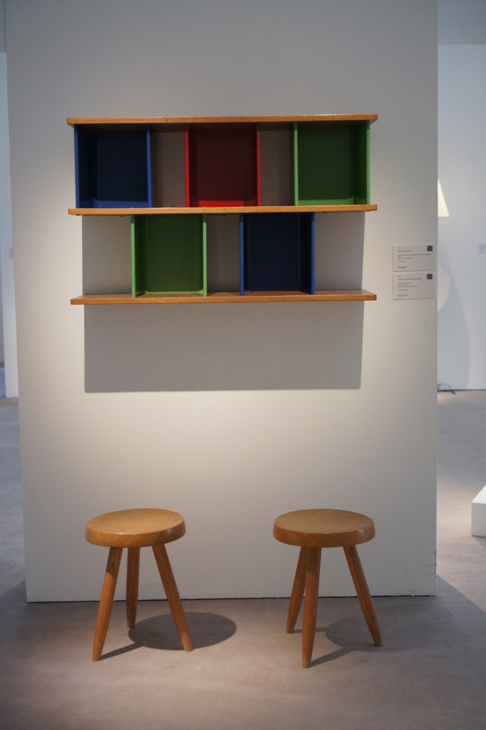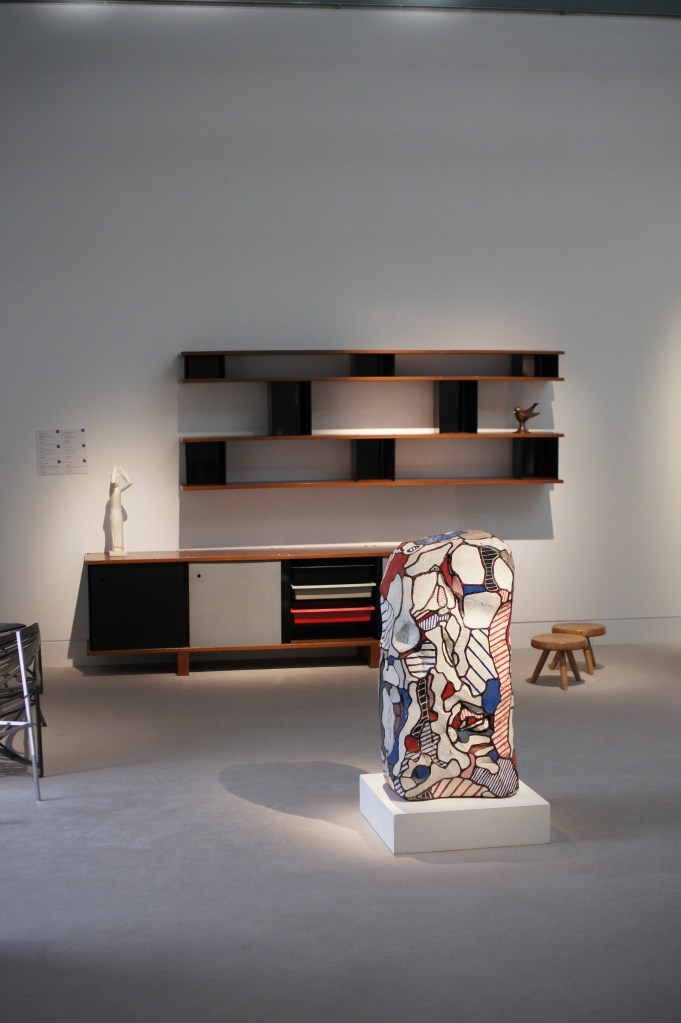 On the left : ca. 1957 Bahut and ca. 1956 Nuage bookcase, Charlotte Perriand ; 1966 Le Domino, Jean Dubuffet ; On the right: ca. 1950 Bookcase (with Jean Prouvé) and pair of stools known as Berger (designed in 1953), Charlotte Perriand