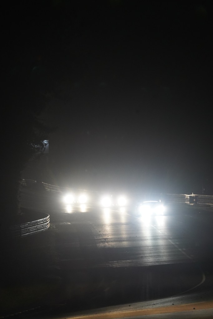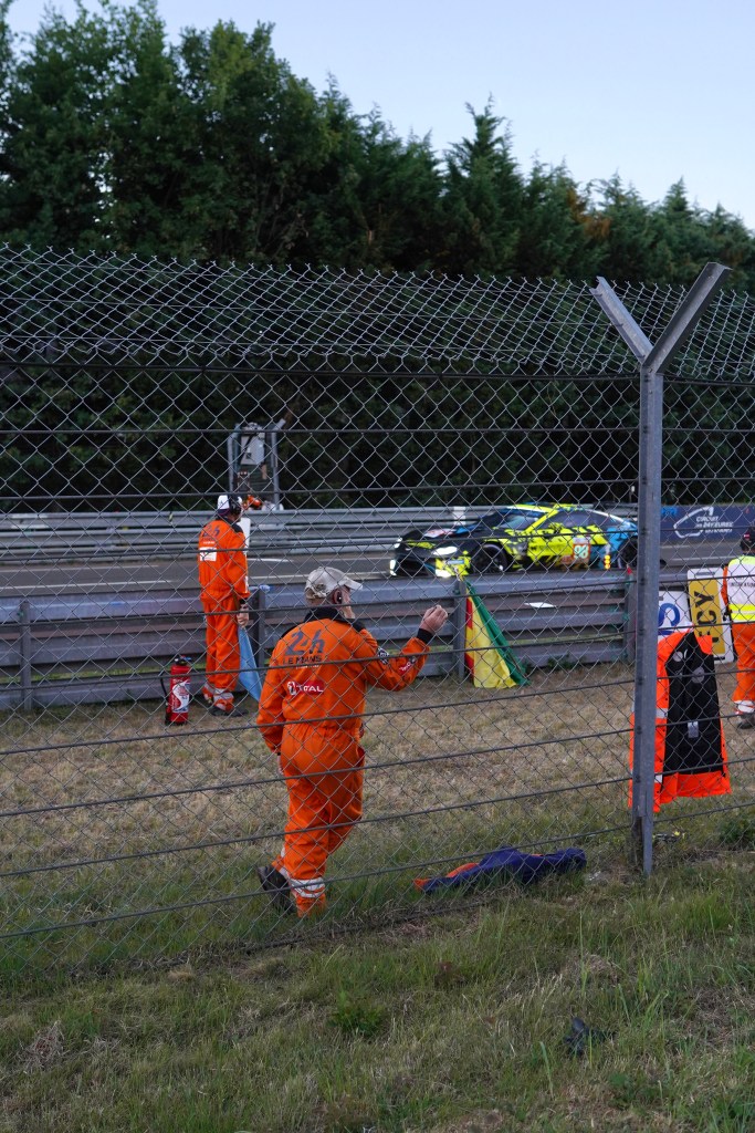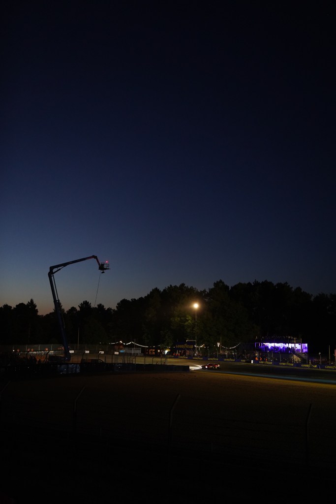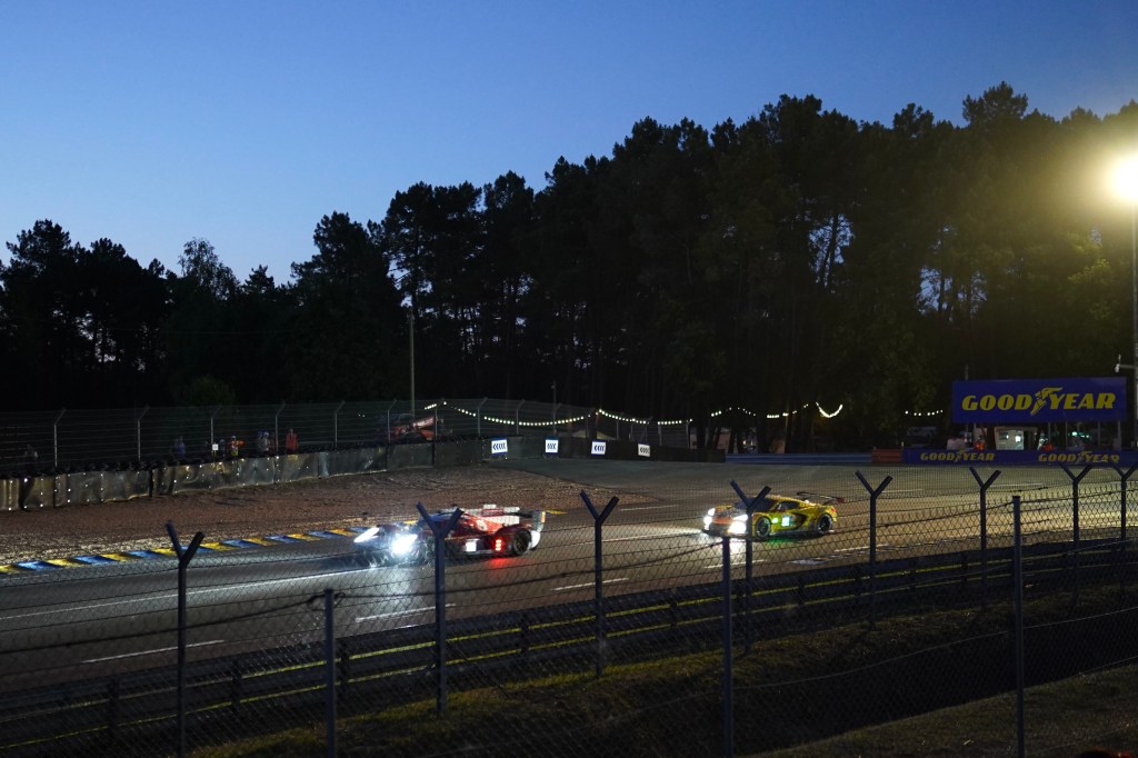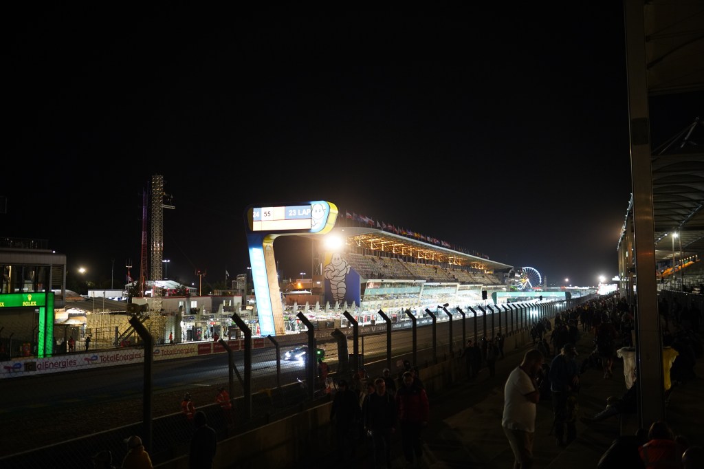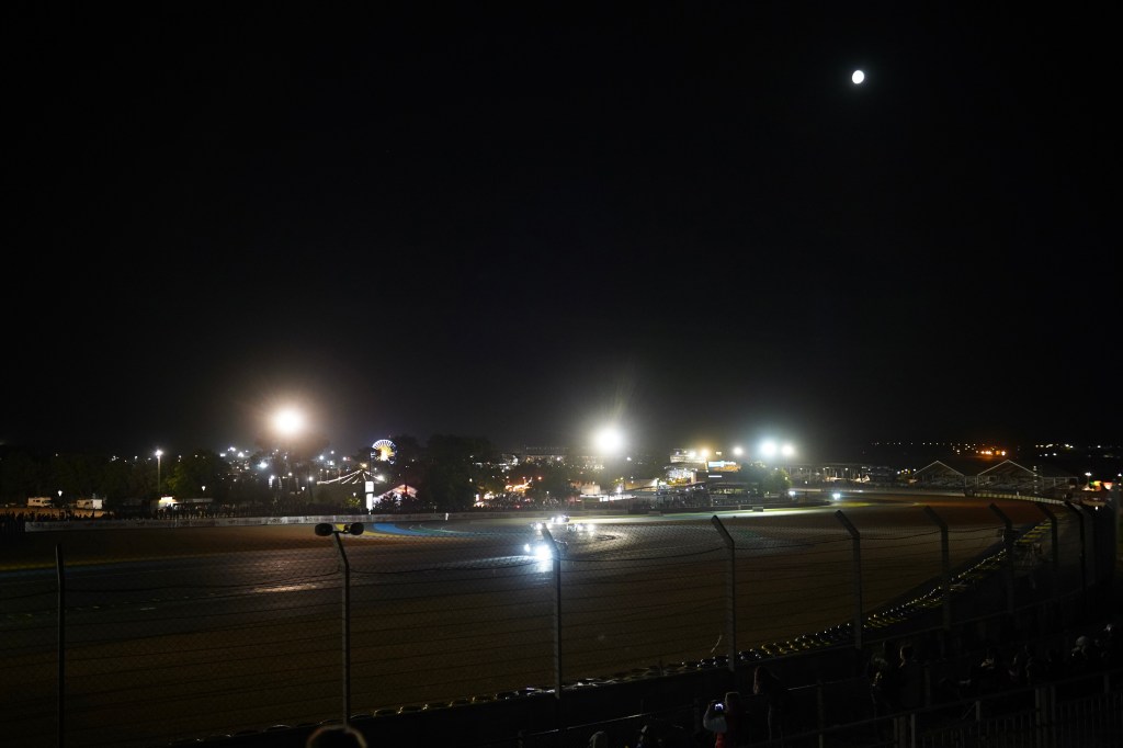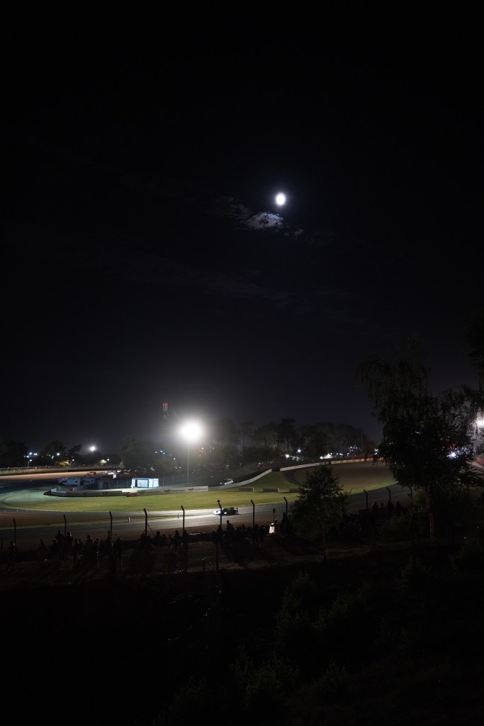 Au coucher du soleil, c’est peut-être à ce moment que les 24 Heures deviennent si spéciales. Une douce quiétude s’empare du circuit, mais les talus autour de la piste restent garnis jusqu’à une heure avancée de la nuit. Alors que les voitures continuent de tourner tous phares allumés, berçant certains spectateurs endormis sur le bord de la piste, il n’est pas rare de croiser des groupes légèrement éméchés, mais toujours dans une bonne ambiance, ou d’autres rejoignant leurs tentes à Beauséjour ou sur d’autres campings.