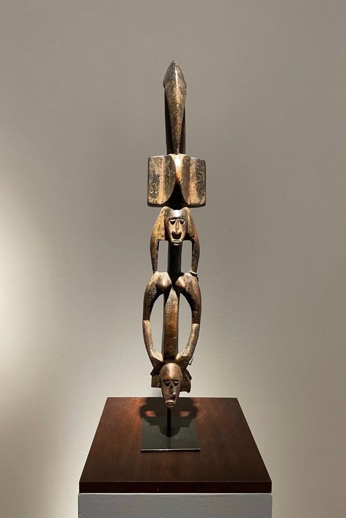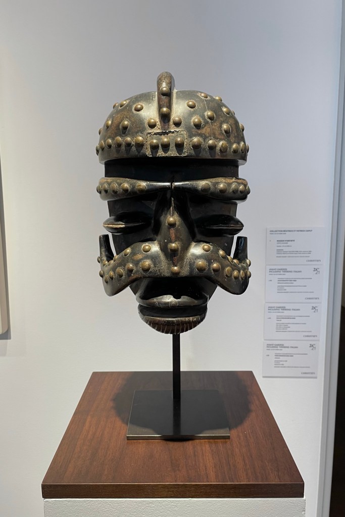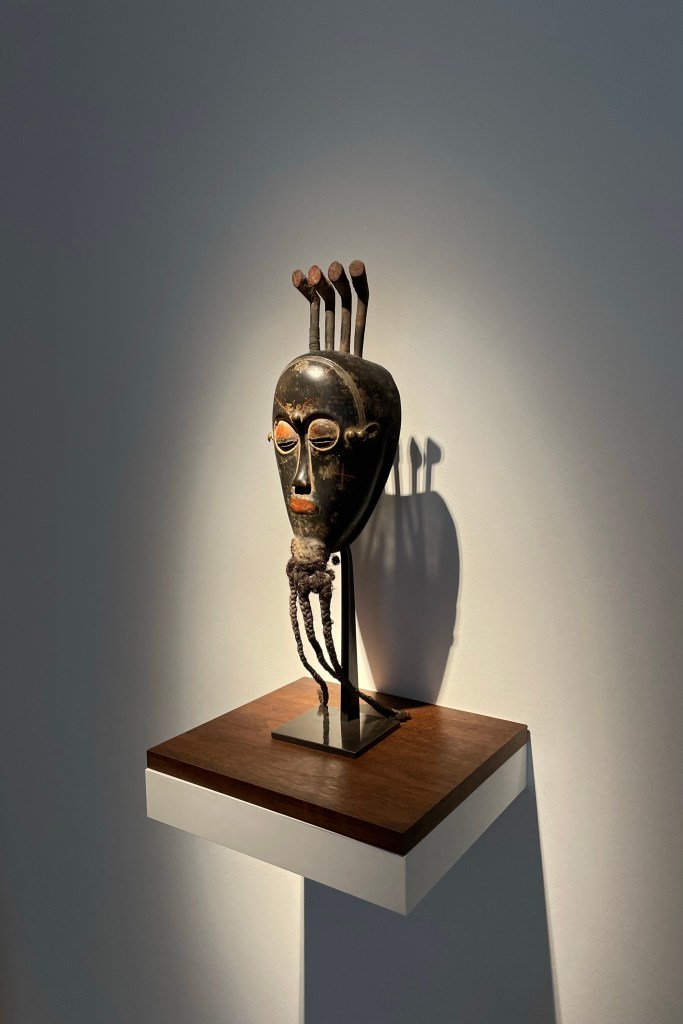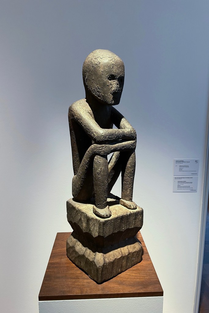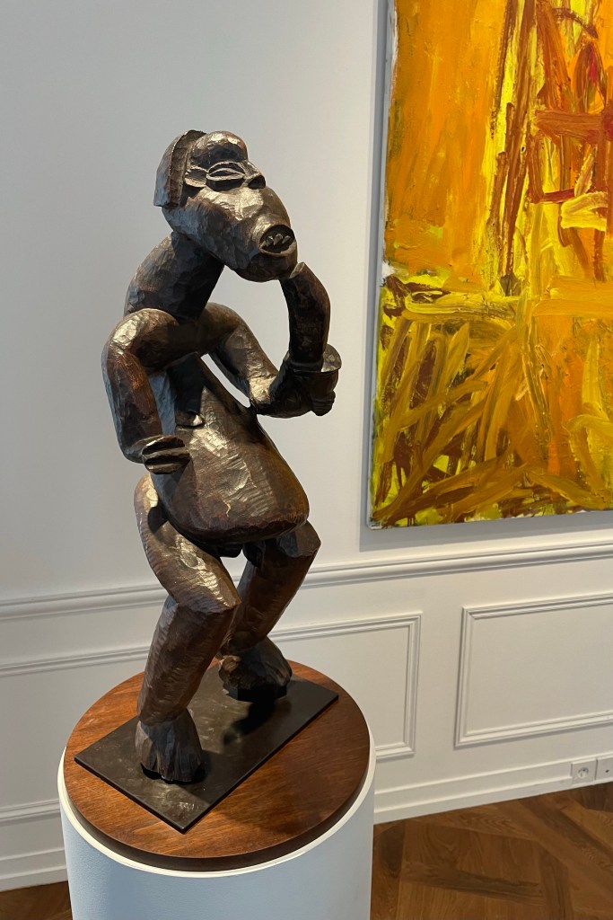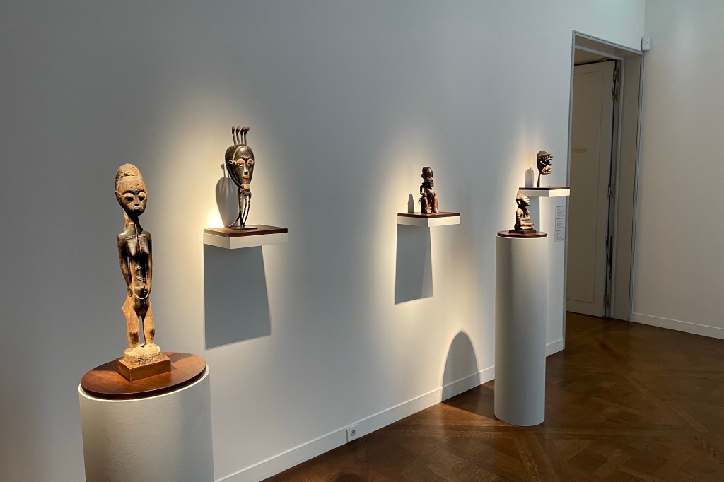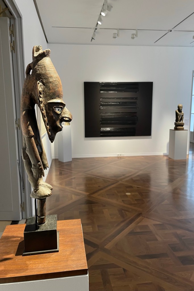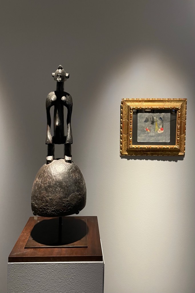 Dans le sens horaire : cimier Sénufo, Côte d’Ivoire (“Painting”, Joan Miró) ; statue Songye, République Démocratique du Congo (“Composition à la poupée”, Fernand Léger) ; statue faîtière Tekoteko Maori, Nouvelle-Zélande ; statue Sénufo, Côte d’Ivoire De haut en bas : statue Dogon, Mali ; serrure Bamana, MaliDe haut en bas : bouchon de flûte Wusear Biwat, rivière Yuat, région du Bas-Sepik, Papouasie-Nouvelle-Guinée (“Peinture 175 x 222 cm”, Pierre Soulages) ; siège à cariatide Luna-Hemba, République Démocratique du Congo (“Tête d’homme de profil II”, Pablo Picasso)Statue Bulul Ifugao, cordillère centrale, province d’Ifugao, Île de Luçon, République des PhilippinesDe haut en bas : statue Bahau Dayak, rivière Mahakam, province de Kalimantan oriental, Île de Bornéo, Indonésie ; statue Kut Jaraï, région des Hauts Plateaux du Centre, VietnamStatue Bamiléké, Cameroun (“Schwarze Kaffeekanne”, Georg Baselitz)Dans le sens horaire : masque Dan-Mano, Libéria ; masque Bété, Côte d’Ivoire ; masque okuyi Punu, Gabon ; masque Bamana, MaliDans le sens horaire : statue d’autel A-Tshol Baga, Guinée ; statue Kusu, République Démocratique du Congo ; harpe Nedomu Mangbetu, République Démocratique du Congo ; statue Dogon, MaliDans le sens horaire : statue Dogon N’Duléri, cercle de Bandiagara, Mali (masque Bamana, Mali derrière) ; Statue Bamiléké, CamerounDans le sens horaire : masque Baulé, Côte d’Ivoire ; statue Baulé, Côte d’Ivoire ; vue de l’exposition