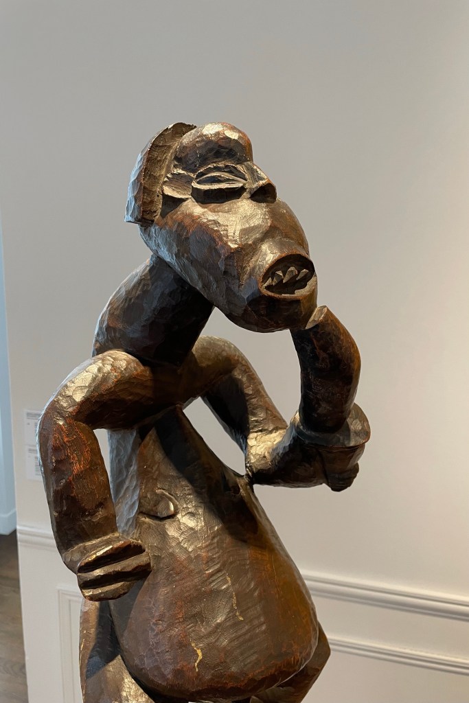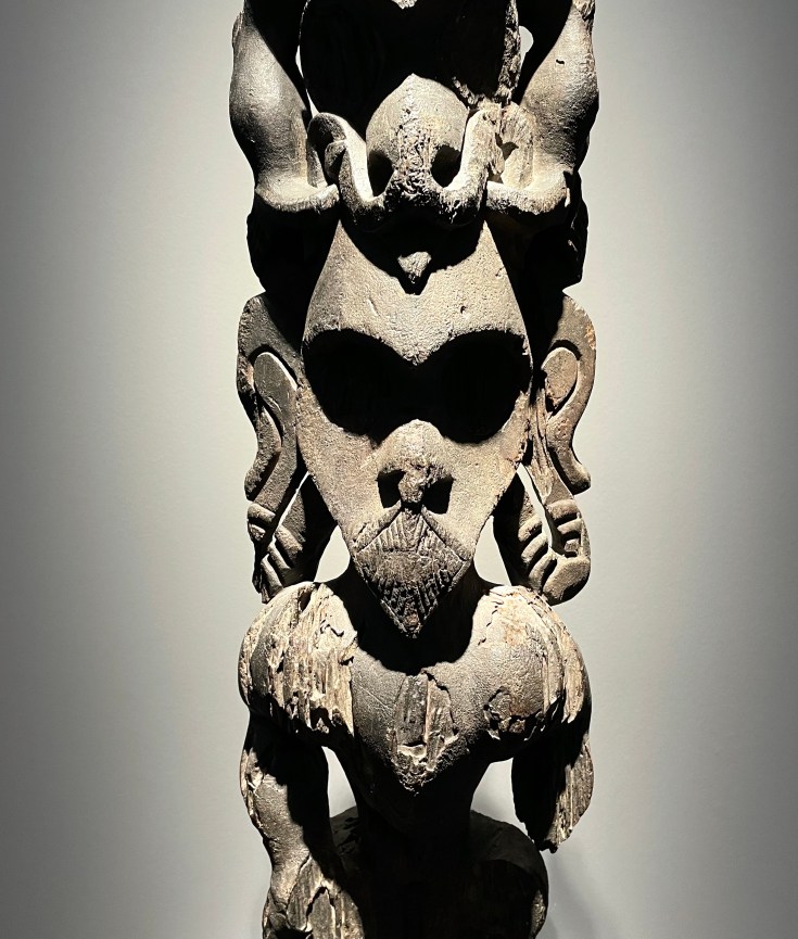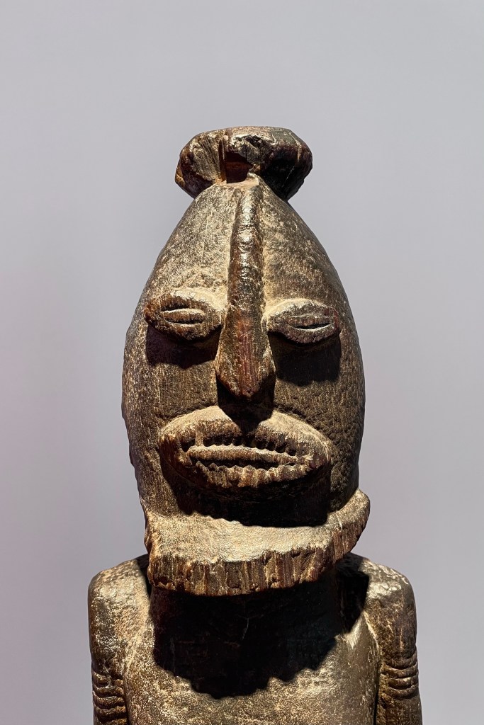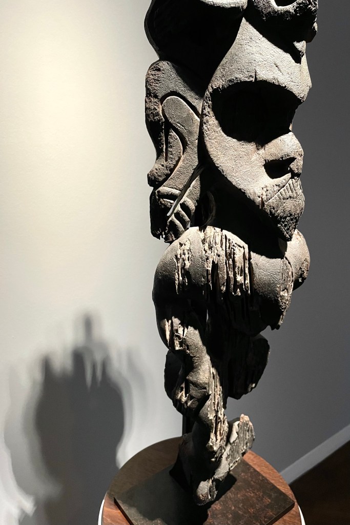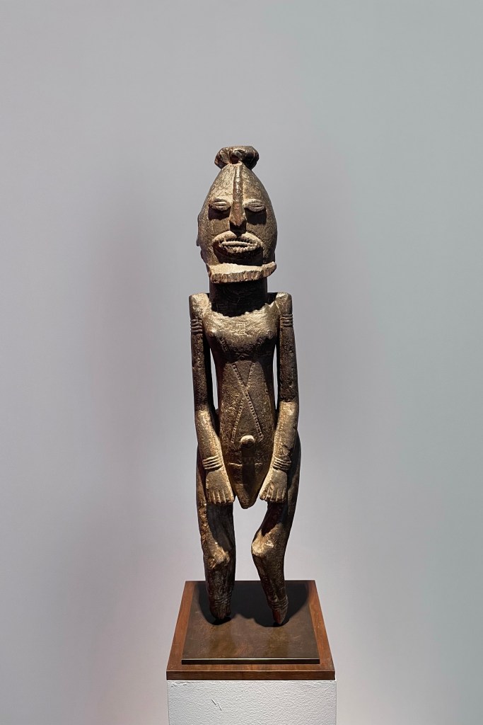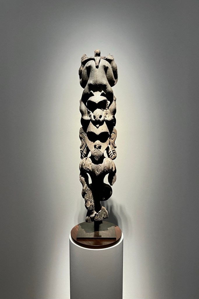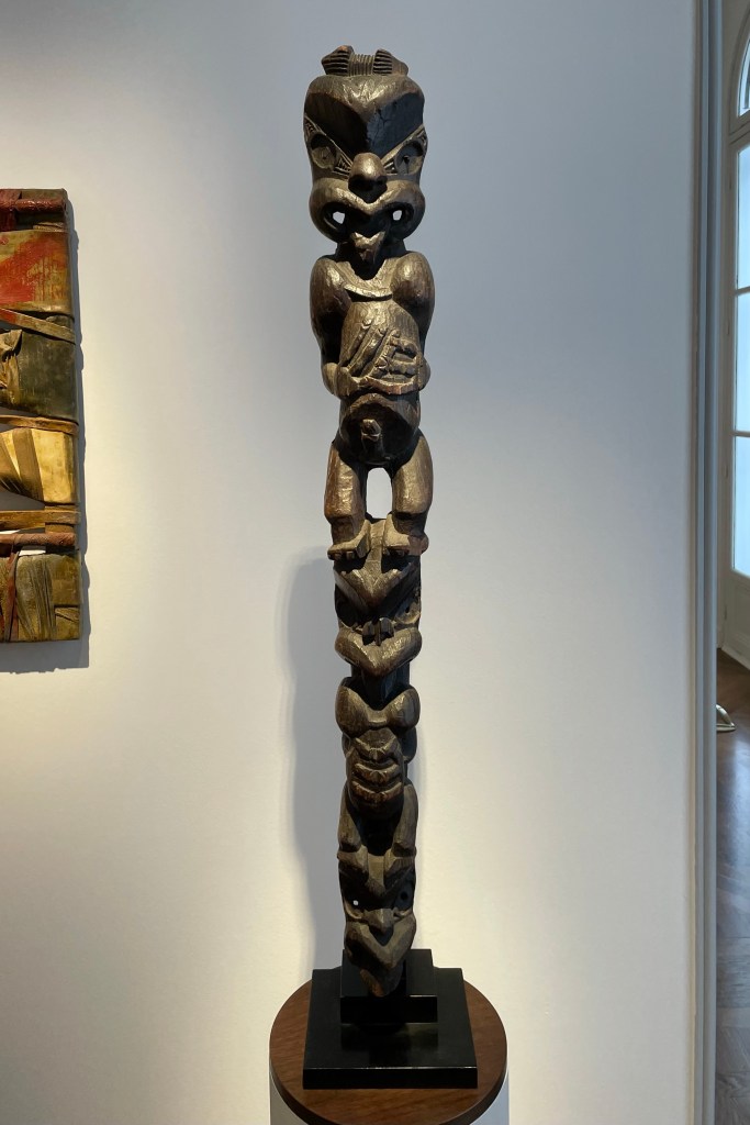 Dans le sens horaire : cimier Sénufo, Côte d’Ivoire (“Painting”, Joan Miró) ; statue Songye, République Démocratique du Congo (“Composition à la poupée”, Fernand Léger) ; statue faîtière Tekoteko Maori, Nouvelle-Zélande ; statue Sénufo, Côte d’Ivoire De haut en bas : statue Dogon, Mali ; serrure Bamana, MaliDe haut en bas : bouchon de flûte Wusear Biwat, rivière Yuat, région du Bas-Sepik, Papouasie-Nouvelle-Guinée (“Peinture 175 x 222 cm”, Pierre Soulages) ; siège à cariatide Luna-Hemba, République Démocratique du Congo (“Tête d’homme de profil II”, Pablo Picasso)Statue Bulul Ifugao, cordillère centrale, province d’Ifugao, Île de Luçon, République des PhilippinesDe haut en bas : statue Bahau Dayak, rivière Mahakam, province de Kalimantan oriental, Île de Bornéo, Indonésie ; statue Kut Jaraï, région des Hauts Plateaux du Centre, VietnamStatue Bamiléké, Cameroun (“Schwarze Kaffeekanne”, Georg Baselitz)Dans le sens horaire : masque Dan-Mano, Libéria ; masque Bété, Côte d’Ivoire ; masque okuyi Punu, Gabon ; masque Bamana, MaliDans le sens horaire : statue d’autel A-Tshol Baga, Guinée ; statue Kusu, République Démocratique du Congo ; harpe Nedomu Mangbetu, République Démocratique du Congo ; statue Dogon, MaliDans le sens horaire : statue Dogon N’Duléri, cercle de Bandiagara, Mali (masque Bamana, Mali derrière) ; Statue Bamiléké, CamerounDans le sens horaire : masque Baulé, Côte d’Ivoire ; statue Baulé, Côte d’Ivoire ; vue de l’exposition