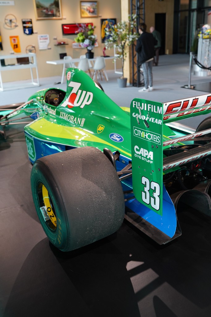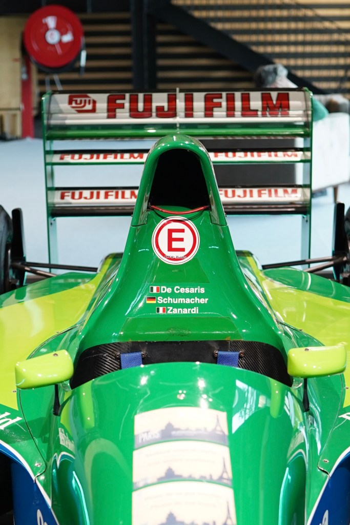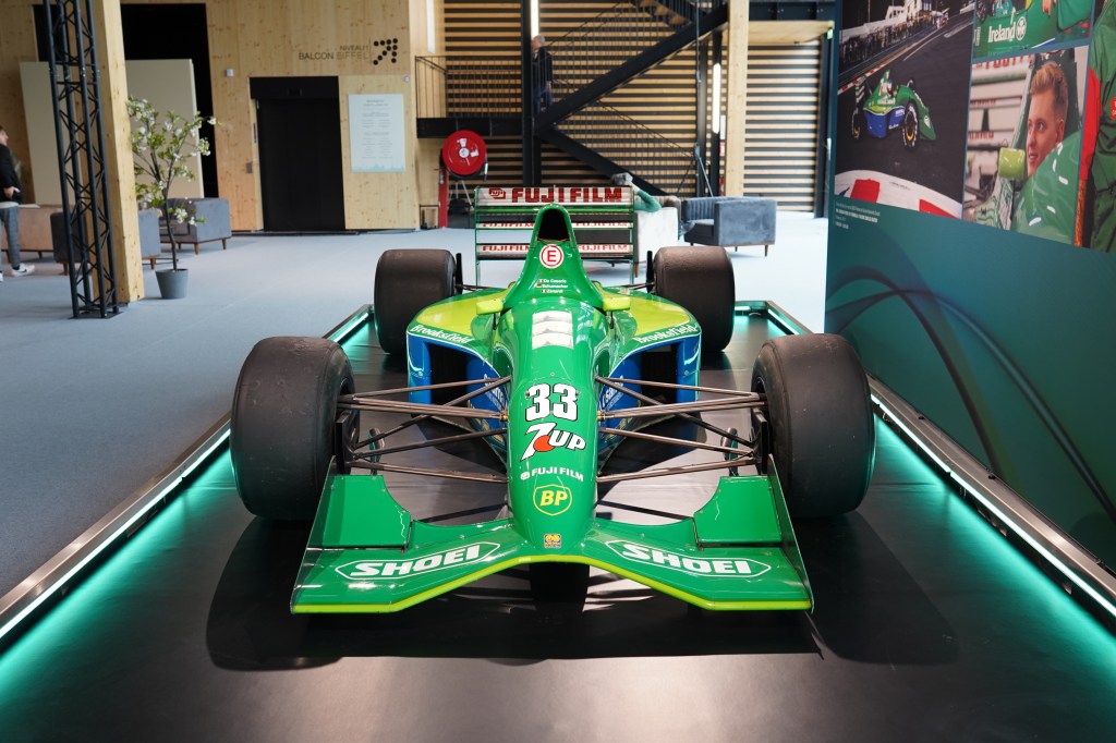 Finissons notre visite du Grand Palais Éphémère avec une voiture unique : Bonhams mettait en vente la monoplace Jordan-Ford 191 de Formule 1 sur laquelle a débuté Michael Schumacher en 1991. C’est sur ce chassis que le débutant allemand et futur septuple champion du monde de Formule 1, a obtenu le huitième meilleur temps de la première séance d’essais précédant le Grand Prix de Belgique. Néanmoins, la course à Spa-Francorchamps sourit moins à Schumi (installé sur un autre chassis que celui proposé par Bonhams) qui grilla son embrayage au départ et dut abandonner avant le second virage du premier tour. Il n’en reste pas moins que les premiers pas du jeune pilote, mais aussi la toute jeune écurie d’Eddie Jordan, marqua les esprits.