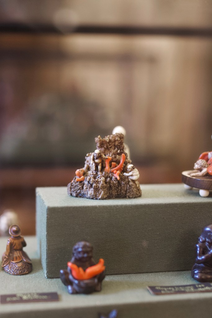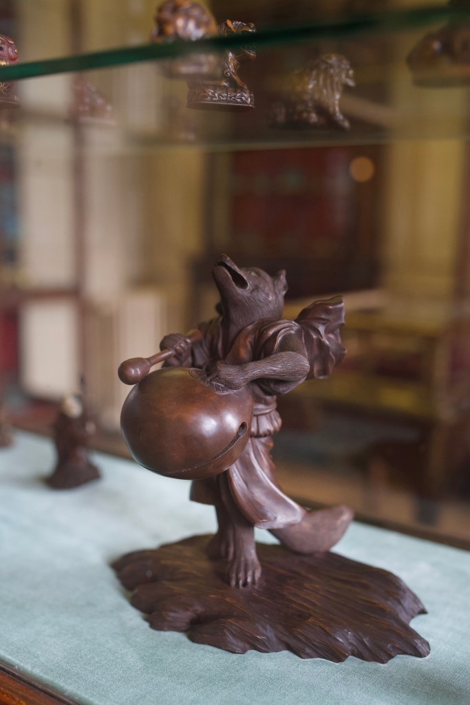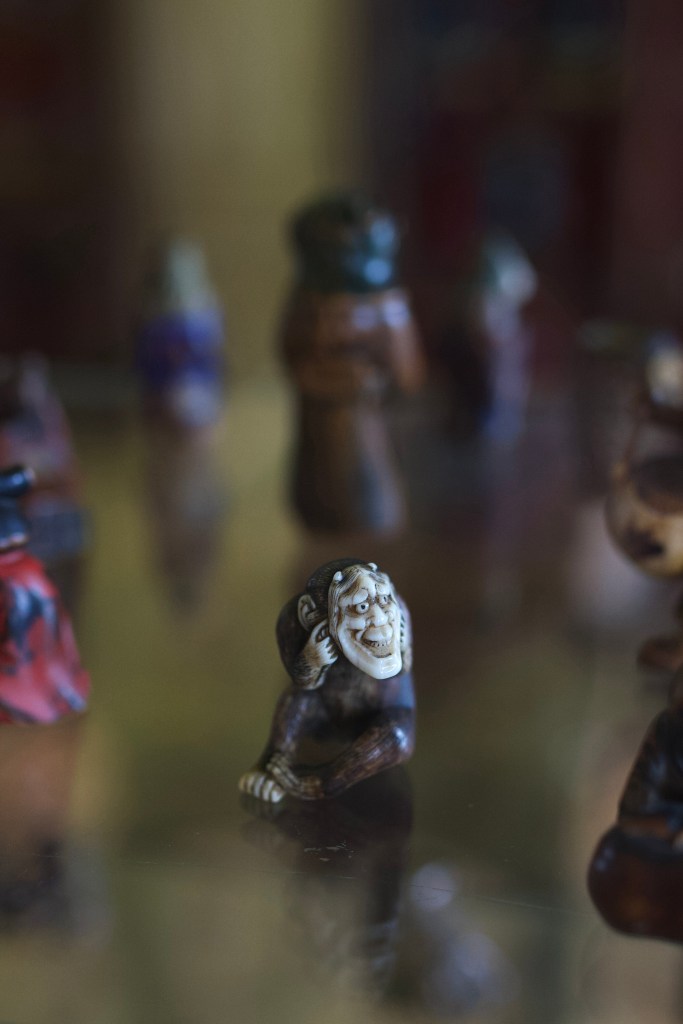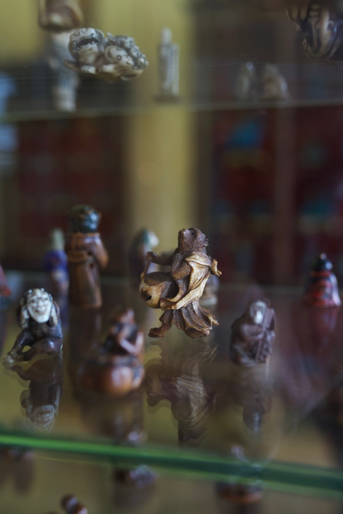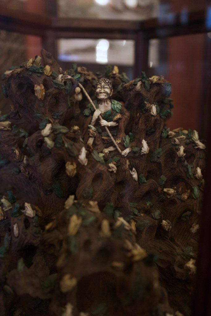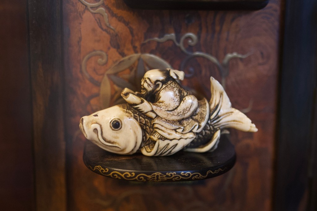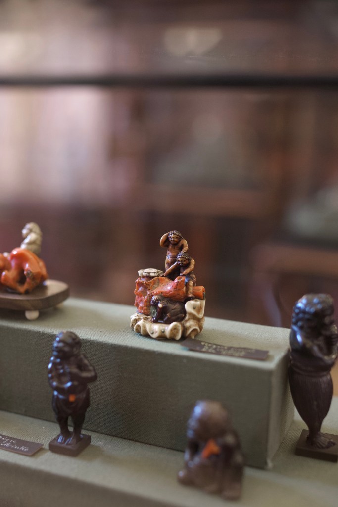 Besides the chimeras, Clémence d’Ennery owned hundreds of netsuke, which is now one of the largest known collection to be exhibited. But, what are the netsuke that she was so passionate about? They are small carvings usually made of ivory, wood or horn used by Japanese men as counterweight to maintain a small compartmentalized box (inro) or any other pouch or container (sagemono) used to transport tobacco, pipes or medicines at their sash (obi). The earlier netsuke are dated from the 17th century. They feature two small holes that permit to pass the cord on which is fastened the inro.