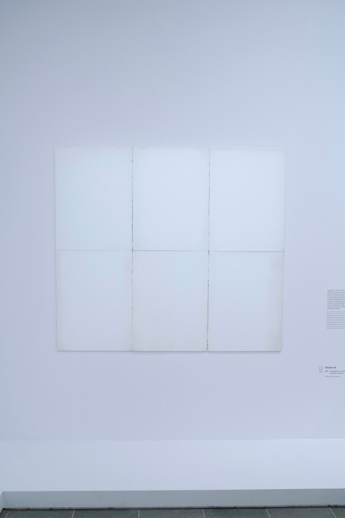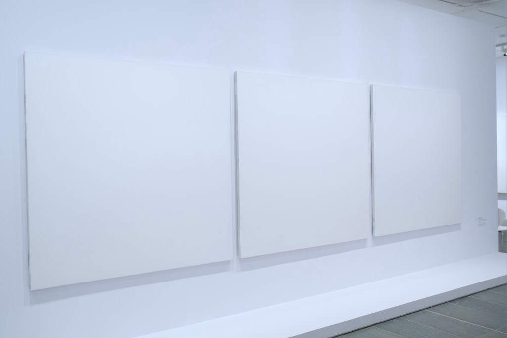 White squares… Like the plain white sleeve of the Beatles’ ‘White Album‘ (1968). Or the ones painted by Kazimir Malevitch on his ‘Suprematist Composition: White on White‘ (1918). Robert Rauschenberg also showed some interest in this thematic with his ‘White Paintings‘ (1951). But Robert Ryman (1930-2019), him, decided to go further: during almost sixty years, he experimented various sizes, materials and media to realize paintings of the same shape (square) and (non-)color.