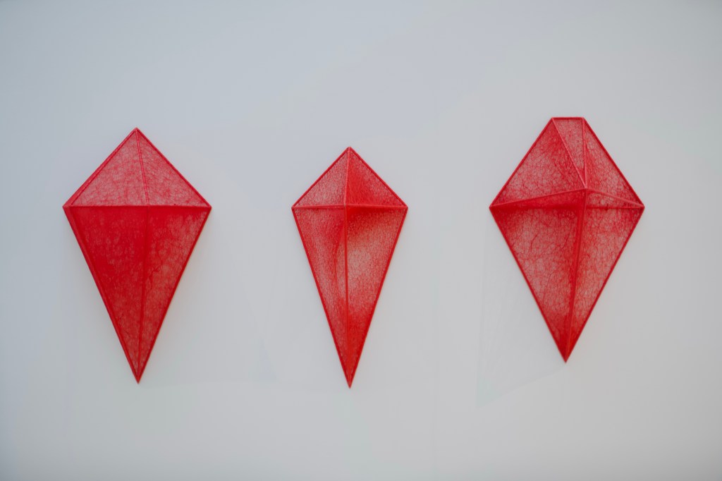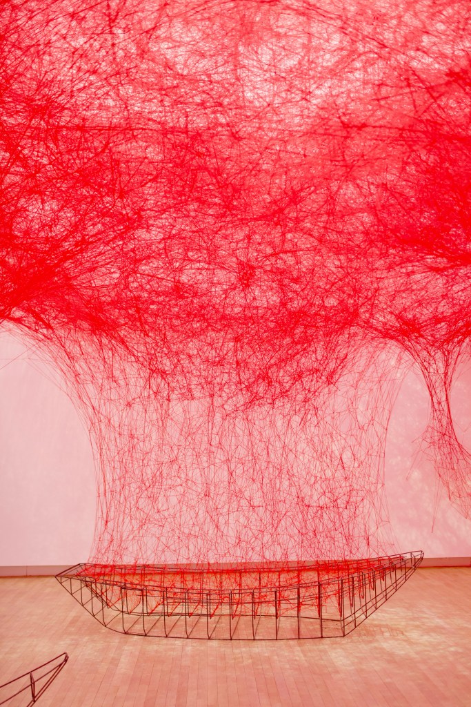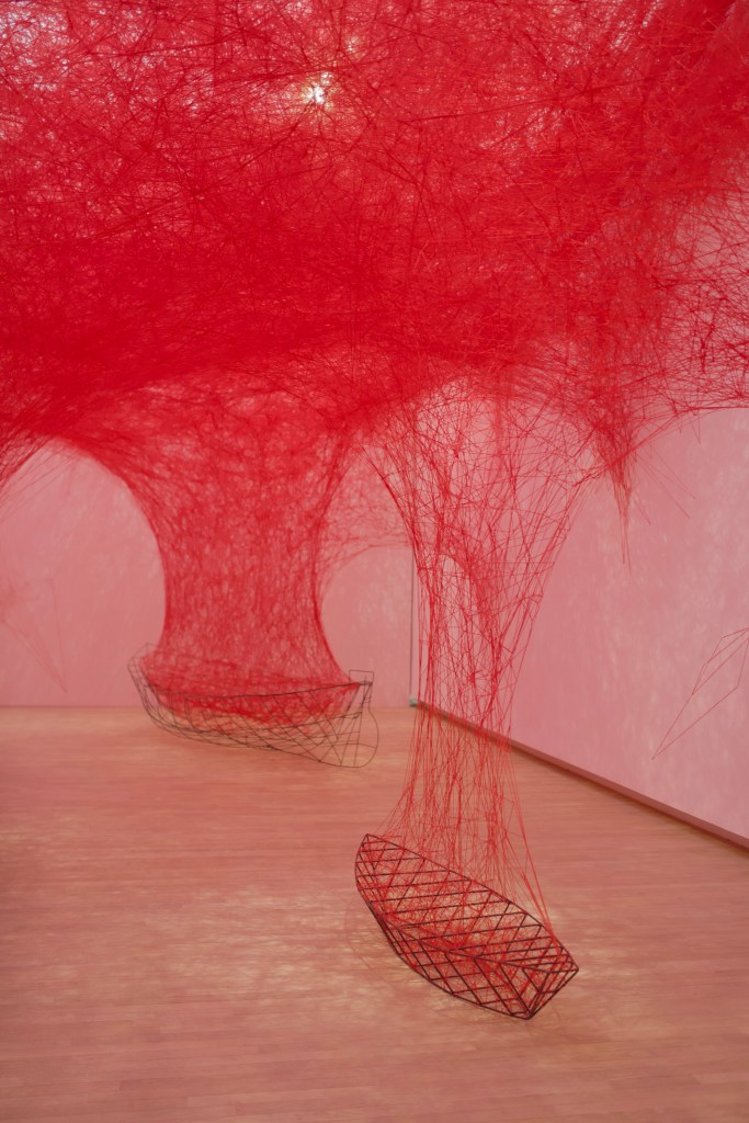 The visit begins with Uncertain Journey (2016-2024), a striking installation composed of several metal frames of small boats from which comes out a complex network of red threads, spreading until the ceiling. Creating an emotion and a link with the visitor is part of Chiharu Shiota’s art : besides the evocation of the travel, one can feel to be part of the work walking in this red muffled ambiance.