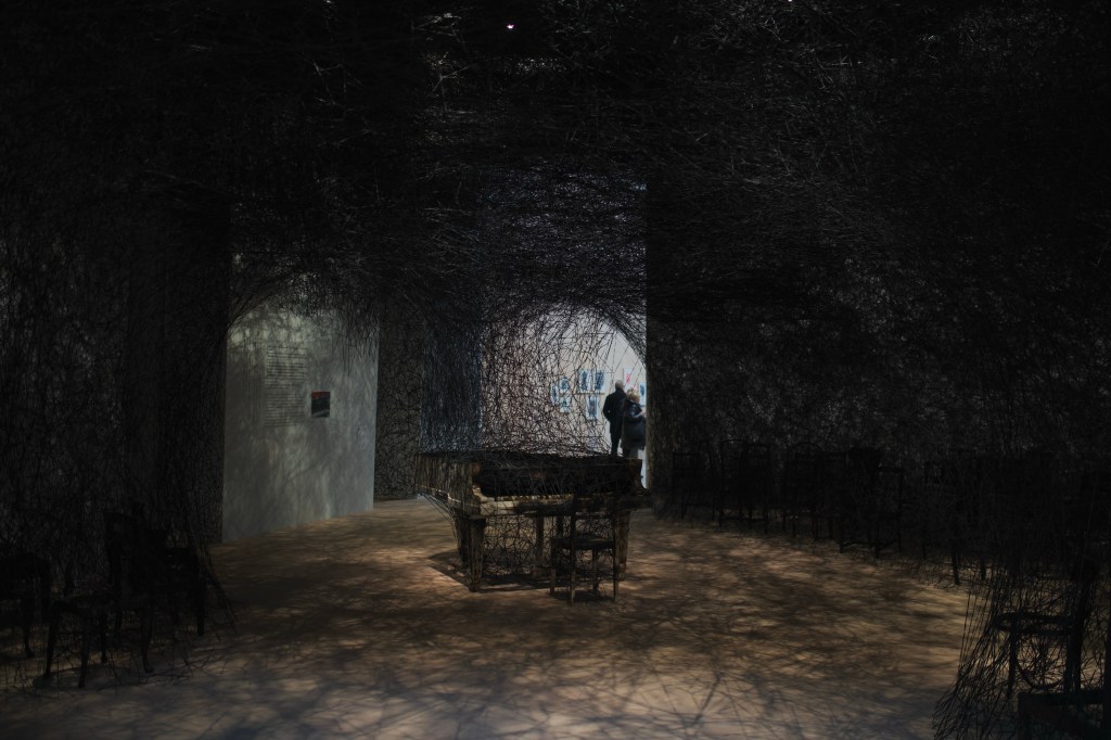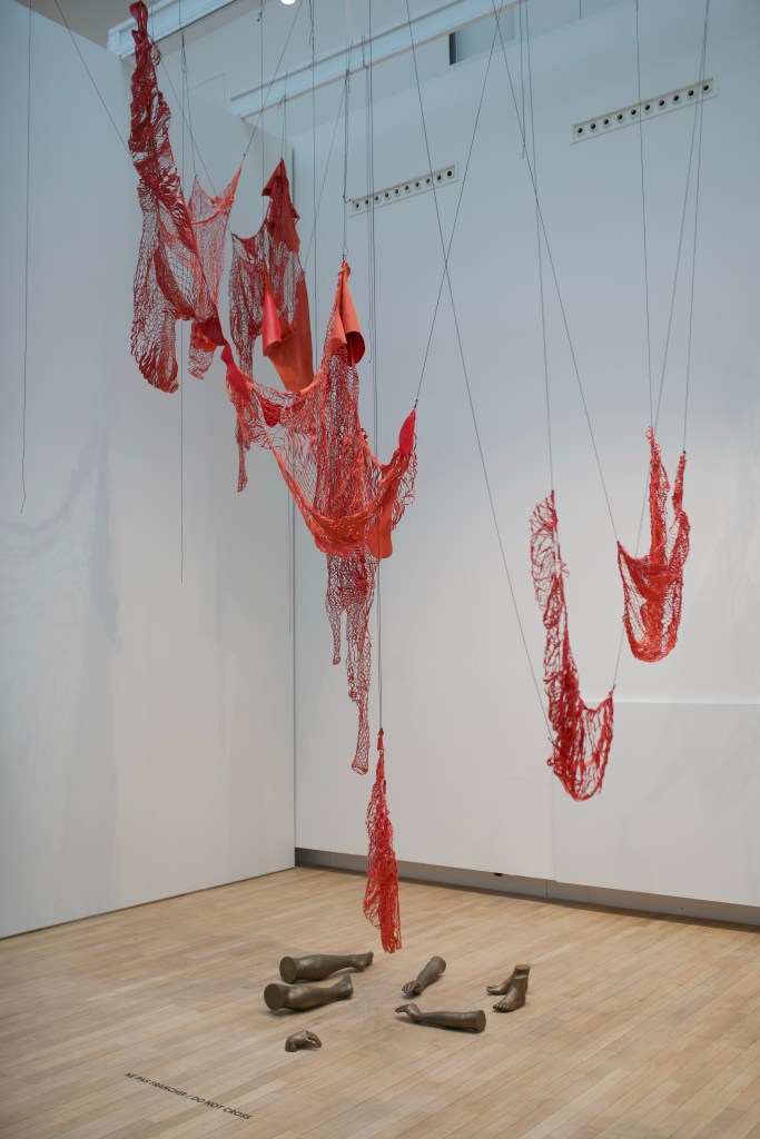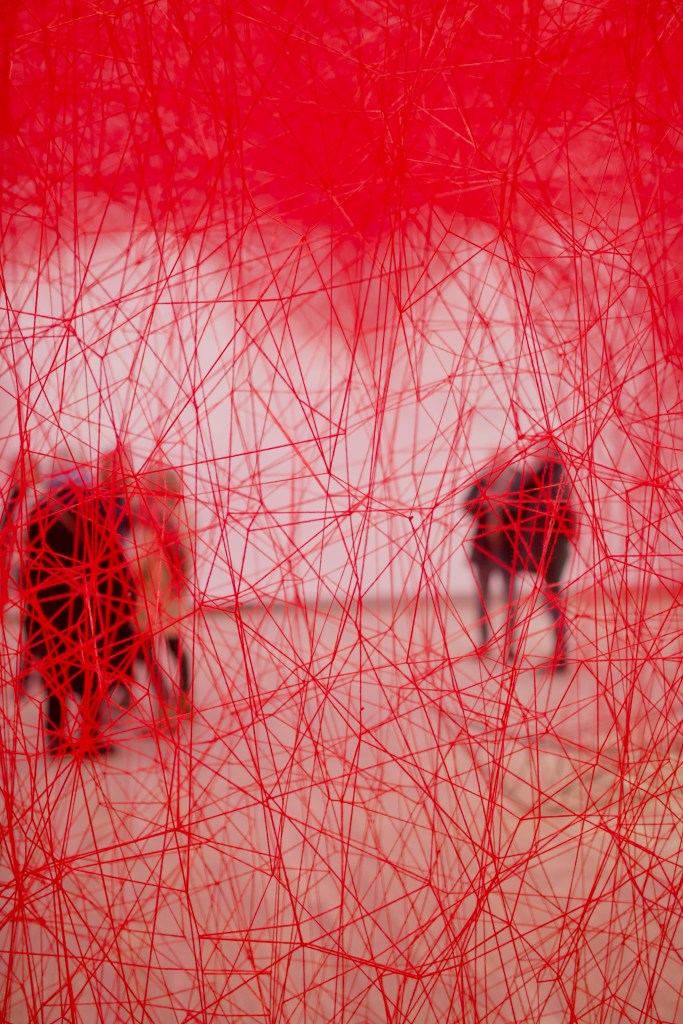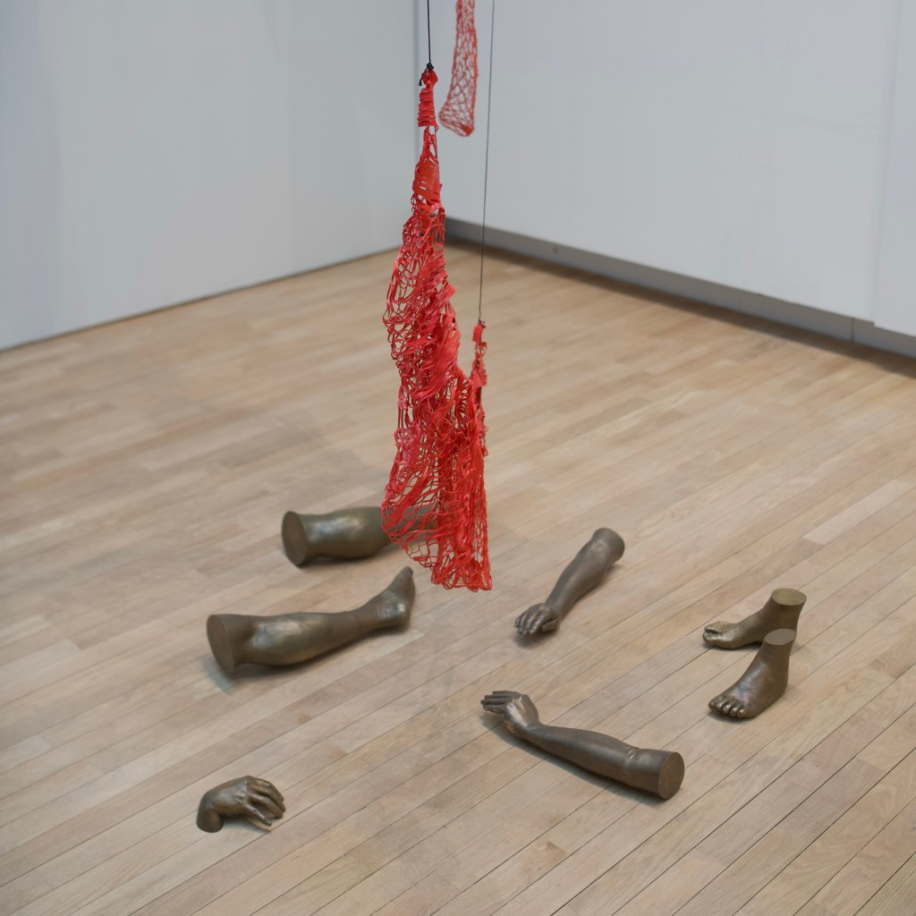 In resonance with the presence in absence feeling she explores, life and death are also present in Shiota’s work. In 2005, she has been operated from an ovarian cancer and suffered a relapse in 2017 she had to treat with chemotherapy. This experience inspired her the installation Out of my Body (2019/2024), in which some red woven leathers are suspended over various body parts mouldings of bronze laid out on the ground. The body may have been ripped and dismembered, but the soul, though not visible, remains present.