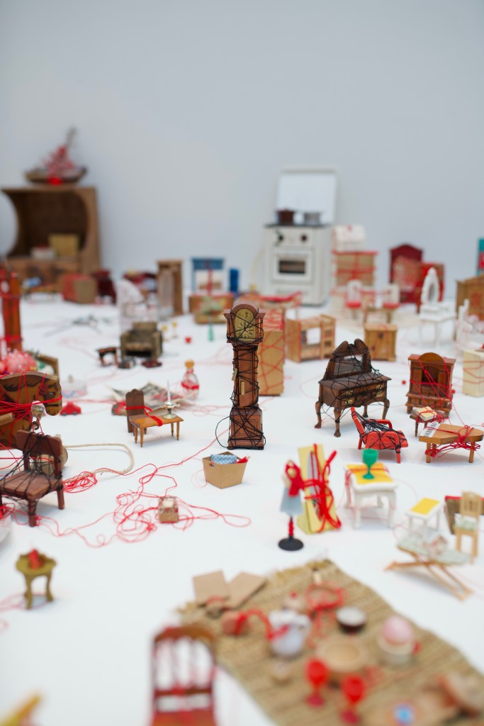 With Connecting Small Memories (2018/2024), which gathers numerous tiny furnitures and household items from dollhouses, linked together with some red and black yarns, she invokes the memories of a forgotten past she shares with the visitor through the threads. This past is not there anymore yet physically present with this collection of small objects.