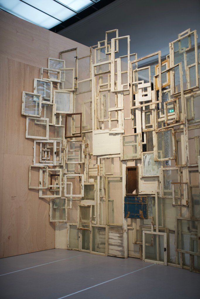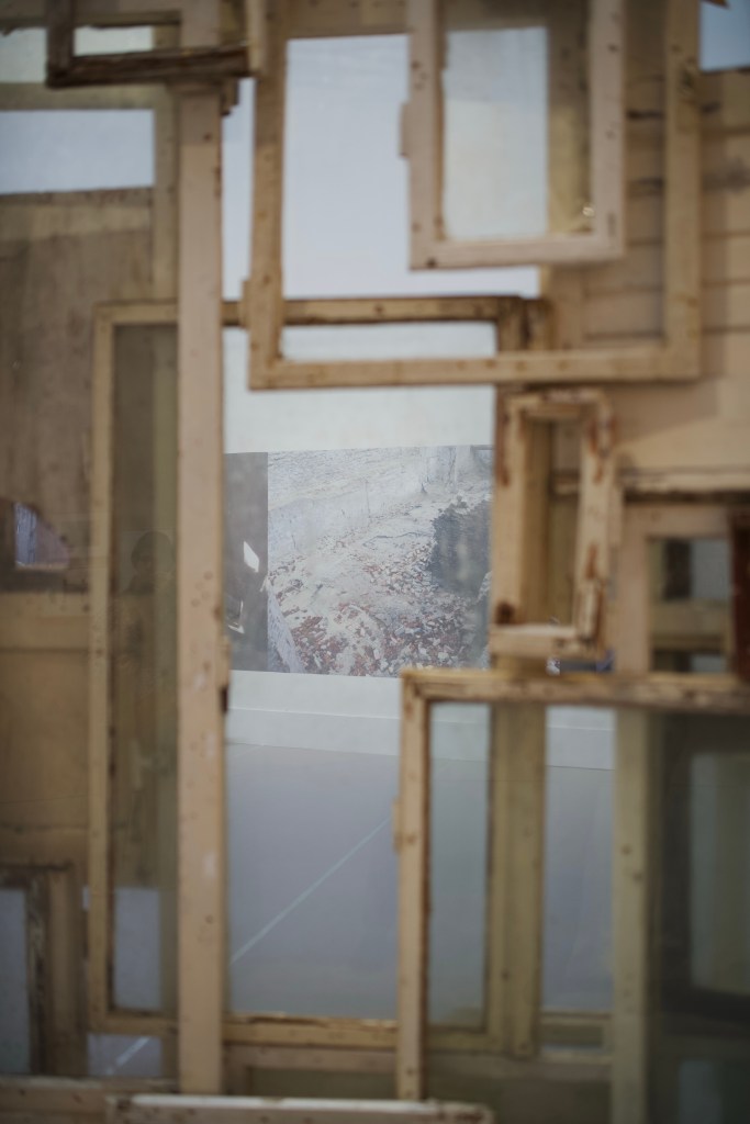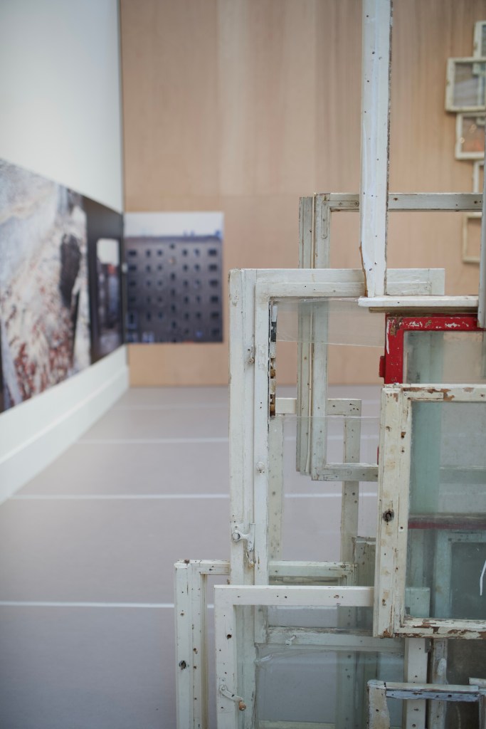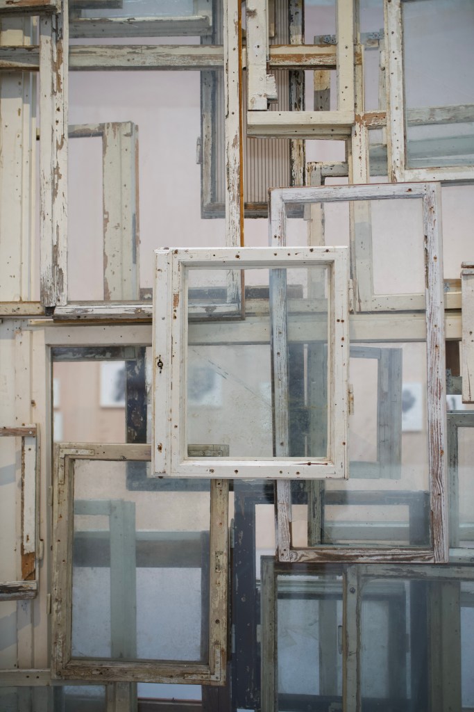 In Berlin, she spent six months to collect used windows, day and night, all over the city. The Inside – Outside (2008-2024) installation presents the result of her hunt, supported by large format photographies of destruction sites and destroyed buildings taken in the German capital. She stated: “When I see the old windows that have been replaced and discarded on the Berlin construction sites, I remember how East and West have been separated during twenty-eight years and I think of the life of these people of the same nationality, speaking the same language, of the way they were seeing their life in Berlin and the thoughts that came to their mind.“