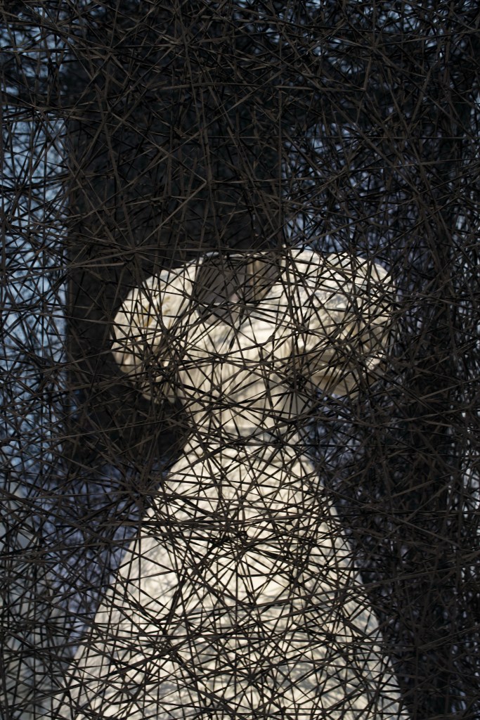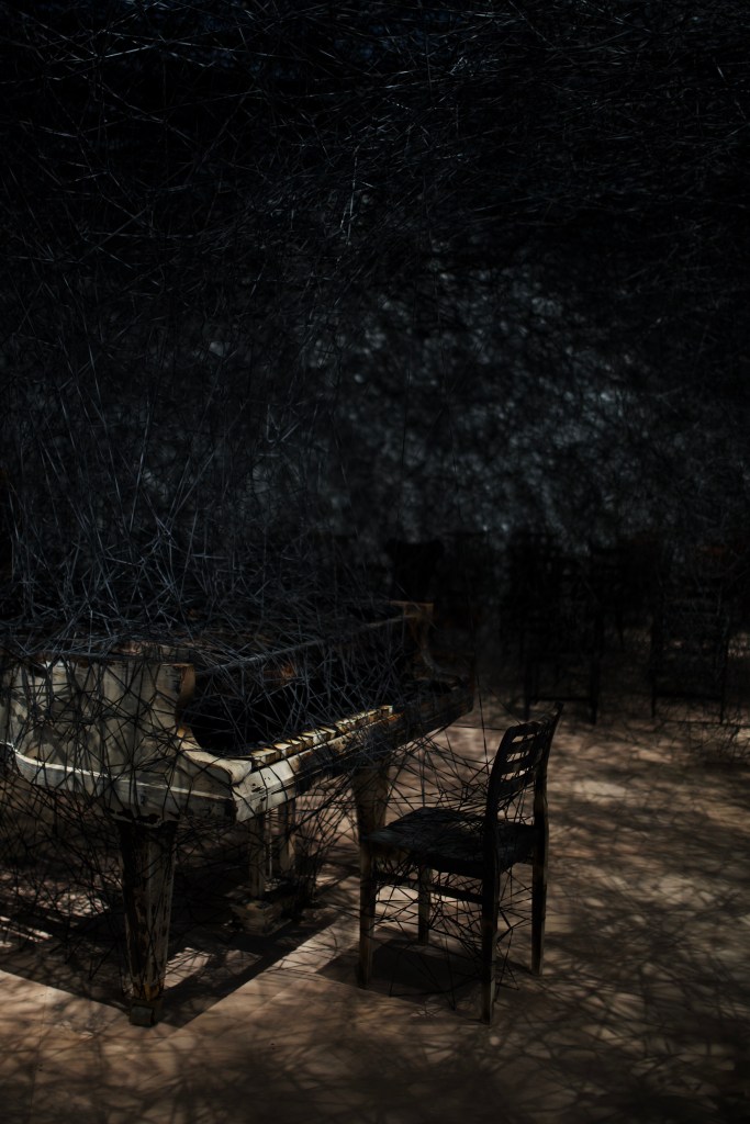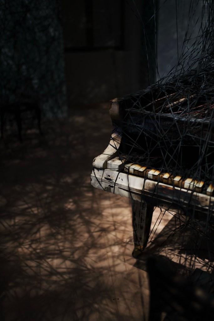 To the Uncertain Journey that opens the exhibition with its red threads that seems to spring out like blood (symbol of life) all over the room, answers the dark and mysterious In Silence (2002-2024) and its black yarns (reminding death) that expand over a burnt piano and several concert room chairs in a theatrical way. The installation refers to the memory of a piano the artist had seen burnt near her house as she was nine and the silence she felt during the following days: the strings have been destroyed and no one can play it again, but beyond the silence, one can still imagine the music once produced by this piano.