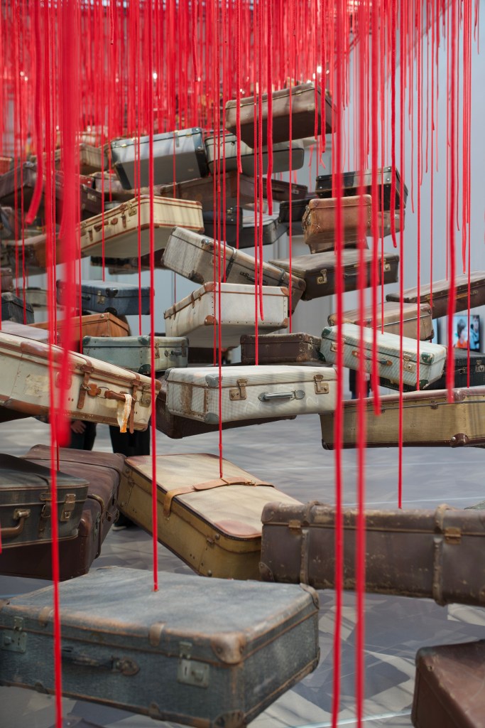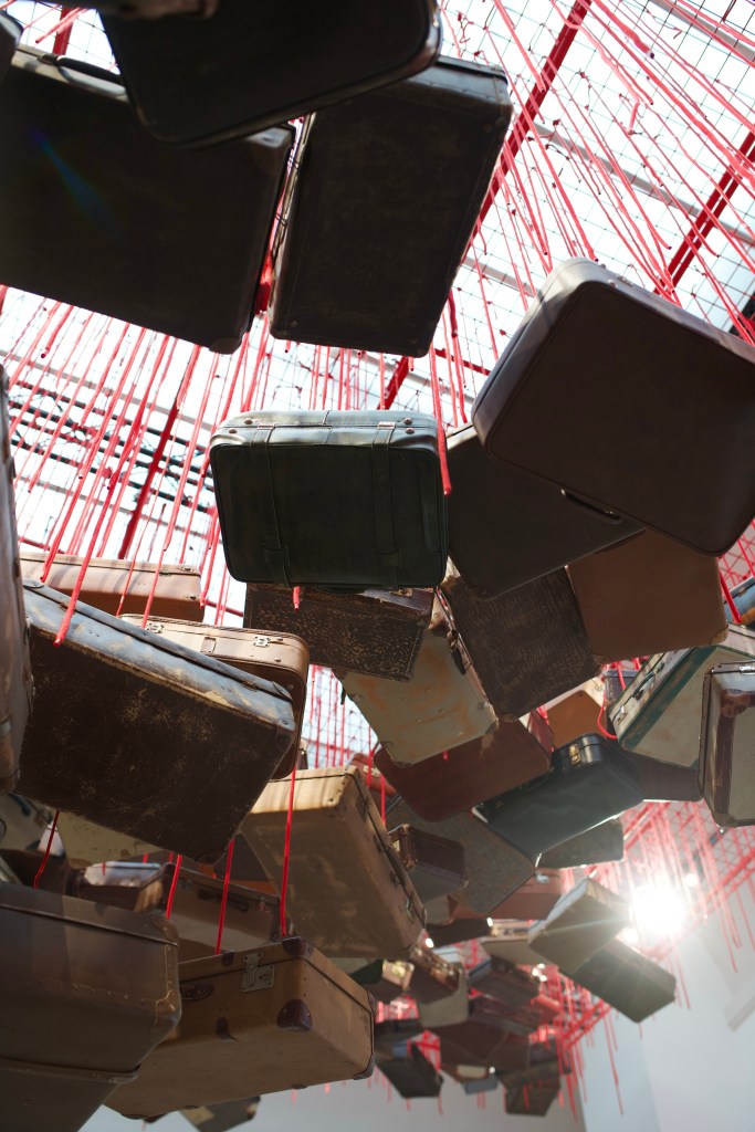 As a Japanese expatriate in Germany, Chiharu Shiota has often questioned her identity, her roots and her expectations. The feeling of distance from her homeland and alienation in a foreign country haunt some of her works. In Accumulation – Searching for Destination (2014-2024), dozens of suitcases are hung from the ceiling with red thin ropes, looking like a staircase going up to the sky. The installation evokes her own feelings and the ones of millions travellers, migrants and moved people all around the world, and raises the both following questions: where are we from? (the accumulation of our lives, materialized by the suitcases) / where are we going? (the destination). This journey is not only physical but also mental, as most people are looking for a goal in their life.