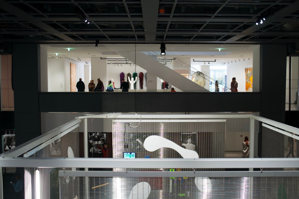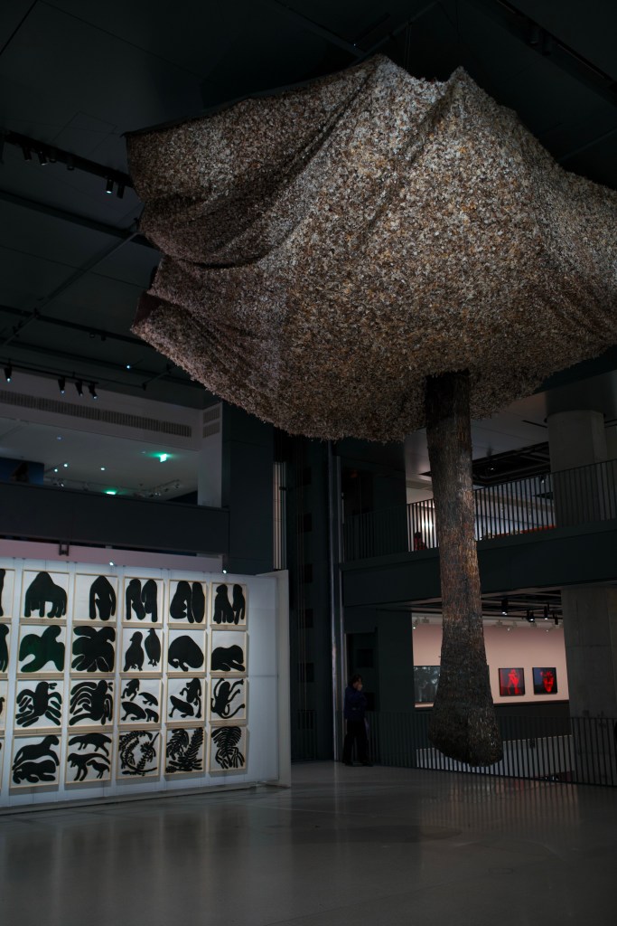 Similarly, Miracéus by Brazilian artist Solange Pessoa—a large-scale installation representing a giant tree covered with thousands of bird feathers, echoing voodoo or shamanic rituals—appears differently depending on whether it is viewed from below, above, or at eye level, and reemerges, sometimes partially, as visitors move through the museum.