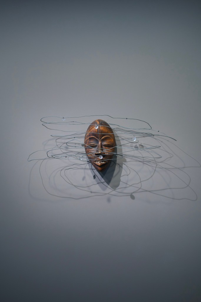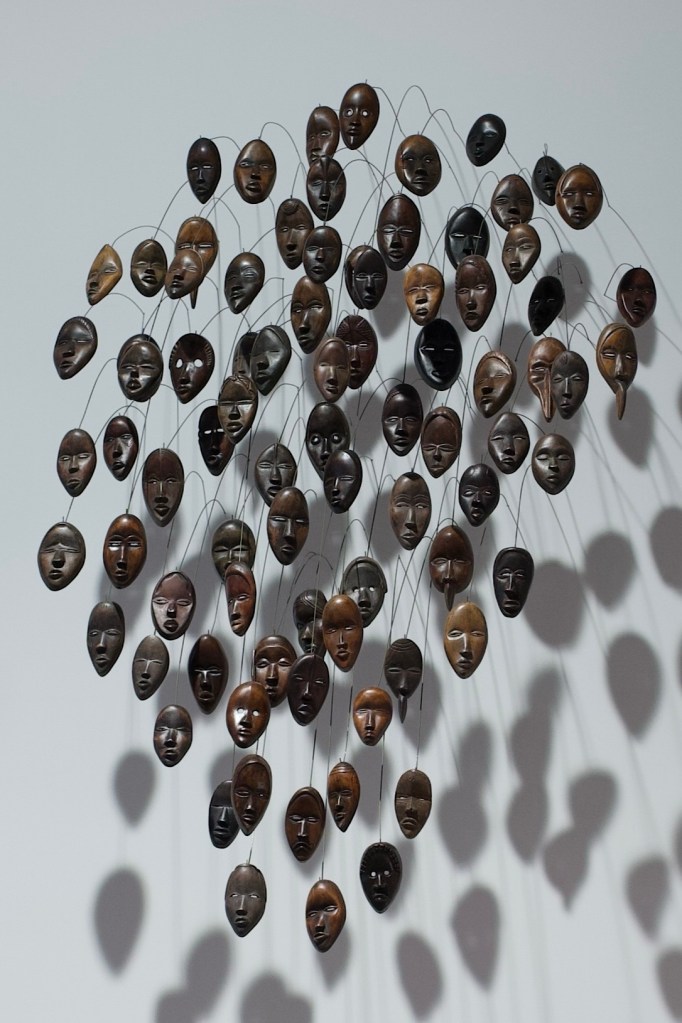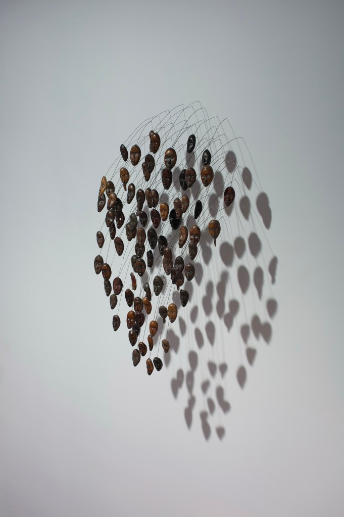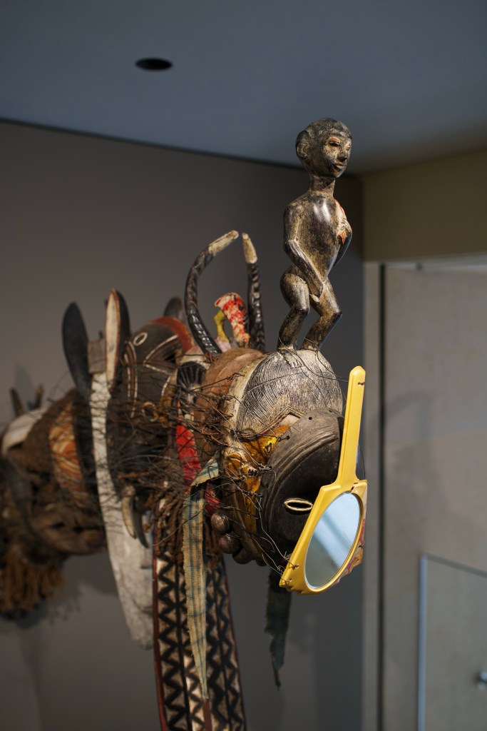 Active since the 1970s, American artist David Hammons is a key figure of the Black Arts Movement, which helped bring African American art into the cultural mainstream. His works in the Fondation’s collection cast a critical light on the fetishization and exoticization of African art. In The Mask, a Dan mask from Côte d’Ivoire appears trapped in a web of metallic wire, while in Untitled (1997) the artist stacks some twenty African masks, bound with wire and capped with a mirror—recalling those found on nkisi nkondi figures. In another Untitled work from 1995, he assembled eighty-four Dan ‘passport’ masks, echoing Arman’s work Accumulation d’âmes, presented in the exhibition Primitivism in 20th Century Art: Affinity of the Tribal and the Modern, held at MoMA in 1984.