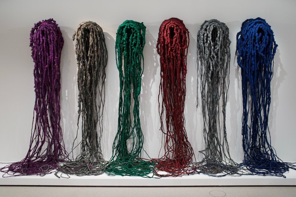 Both from Brazil, Eliane Duarte and Véio draw on the culture and techniques of their country. Duarte does so through a composition made of side-by-side balls of coloured yarn (Ribalta), which echoes the ancestral sewing practices of Brazilian women, while Véio’s Grupo de Penitentes depicts a religious procession taking place during penitential rituals in his region.
