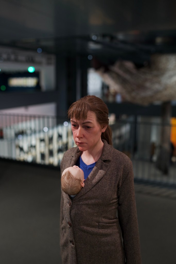 Having renewed sculpture since the mid-1990s, Ron Mueck is represented in the exhibition by one of his ultra-realistic figures, Woman with Shopping. Inspired by a scene from everyday life, the Australian artist quickly sketched a woman he had seen in the street. Lost in thought, she holds two orange shopping bags and carries a small infant against her chest, tucked beneath her coat. As a result, the sculpture, slightly smaller than life-size, is both touching and unsettling.