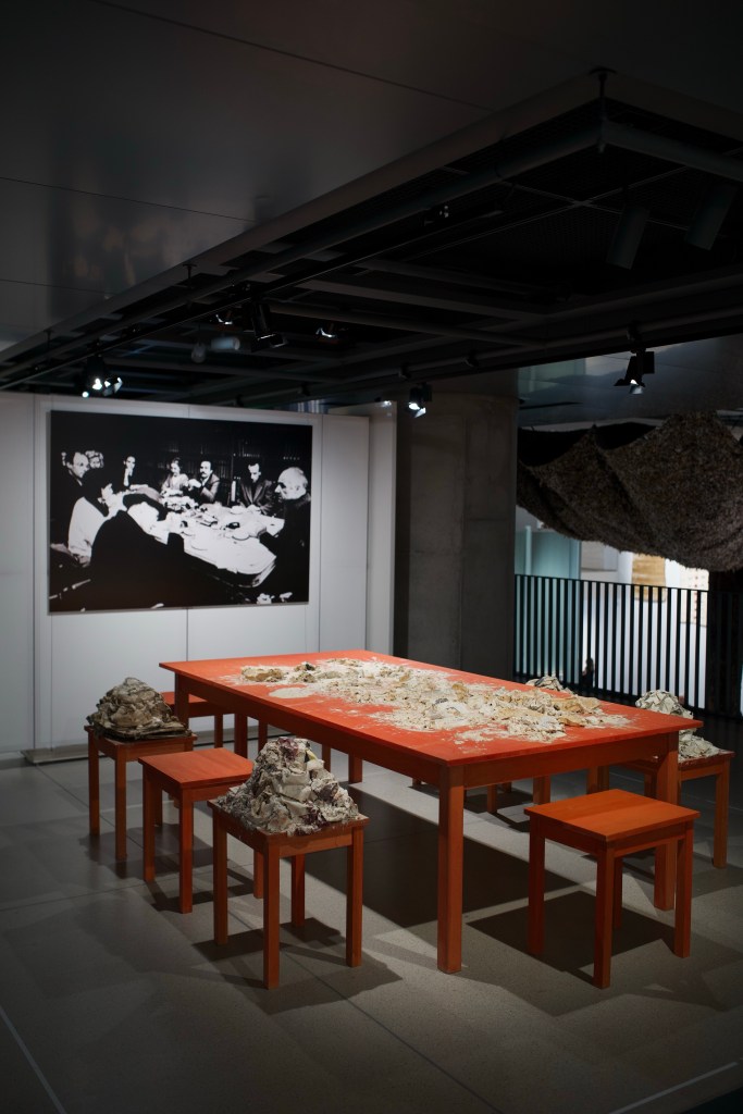 In 1994, Huang Yong Ping’s solo show Devons-nous encore construire une grande cathédrale ? questioned the meaning of the written memory, and the freedom of knowledge and expression through printed media-books and newspapers. The exhibition referred to the artistic project Wir bauen eine Kathedrale (‘We Are Building a Cathedral’), initiated by Joseph Beuys in the 1980s, with three fellow artists-Anselm Kiefer, Janis Kounellis and Enzo Cucchi-in which the so-called cathedral serves as a metaphor for the collective construction of knowledge and society. In Yong Ping’s work, the four artists’ ideas are embodied in their writings, which are pulped and placed on some stools and a table, with a photograph of their meeting in the background.