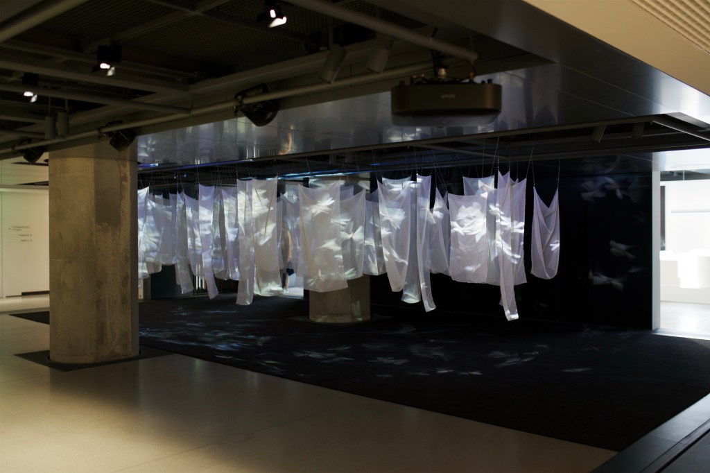 One of the most striking works in the show is perhaps the installation NIGHT WOULD NOT BE NIGHT WITHOUT THE CRICKET. Created in collaboration with Soundwalk Collective, it invites visitors to walk through a dark corridor, experiencing eight soundscapes drawn from Bernie Krause’s archive, who has recorded nearly 5,000 hours of field bioacoustics since 1968. The result is a singular visual, auditory, and sensory experience.