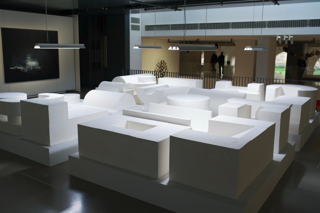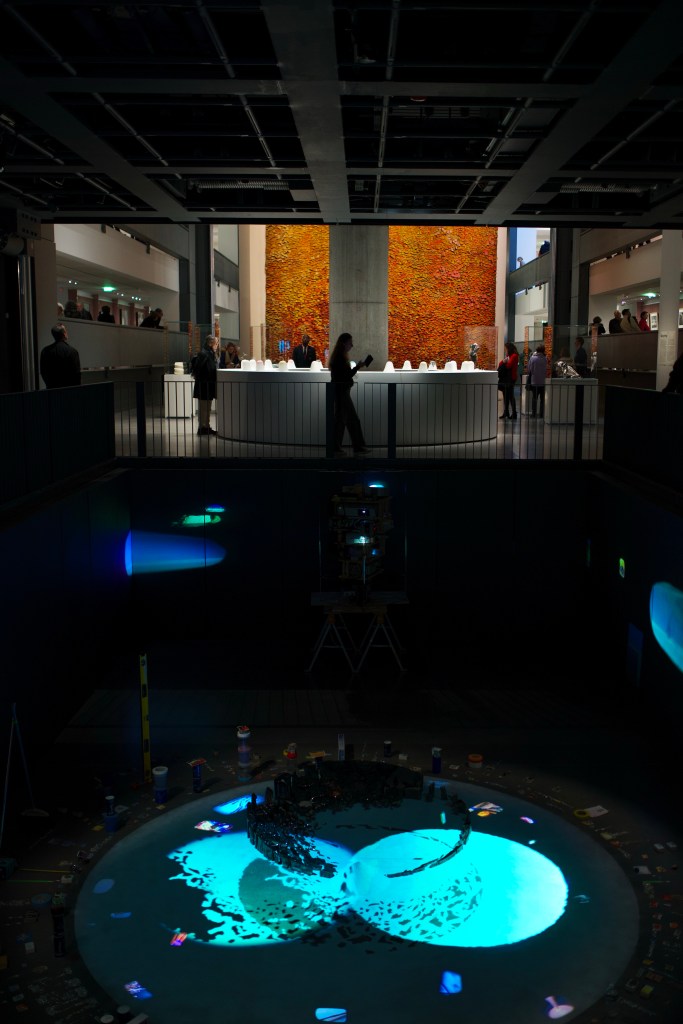 With Tracing Fallen Sky, American artist Sarah Sze presents a work that defies classification, combining a pendulum, video projections, and a wide range of media. The installation consists of 116 3D-printed stainless-steel elements, along with their imprints, arranged in a large circle of marble dust, evoking an archaeological ruin. Across this surface, videos of materials in transformation are projected, blurring the boundary between the virtual and the physical.