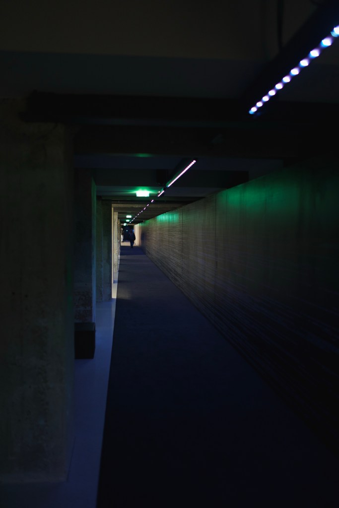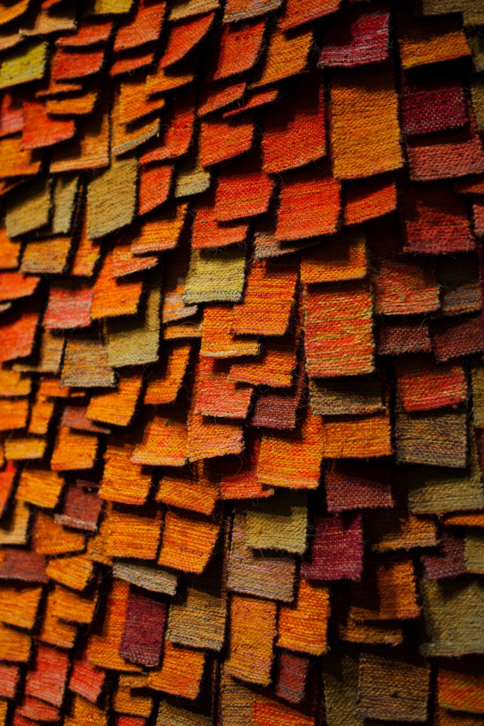 Located in the basement and visible from the ground-floor alleyways, the monumental Muro en rojos (7 meters high and 8 meters wide), composed of rectangular woven elements and colored in a gradient from red to light green, with a range of orange hues in between, evokes Olga de Amaral’s landscapes as well as the brick façades of her native Bogotá.