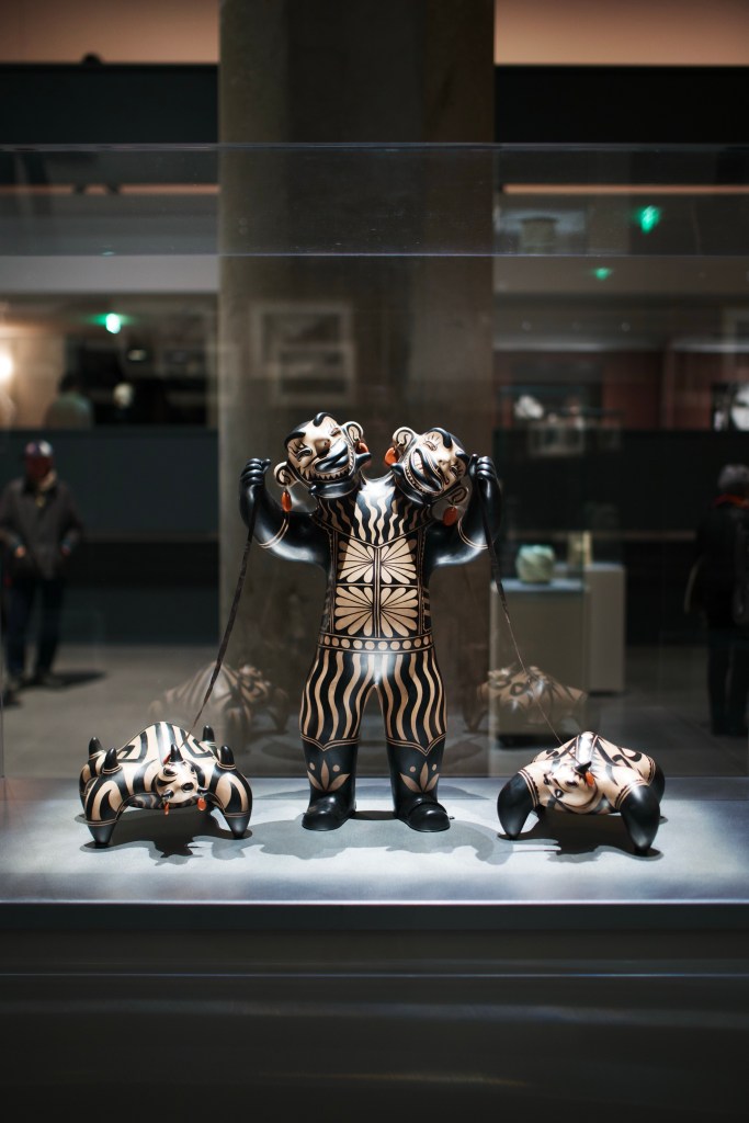 Nearby, Virgil Ortiz’s ceramics are made from red clay sourced from Cochiti Pueblo, a village in New Mexico that is home to Native American Pueblo communities. His works reinterpret traditional Pueblo satirical figurines, infusing them with contemporary references drawn from science fiction and punk culture.