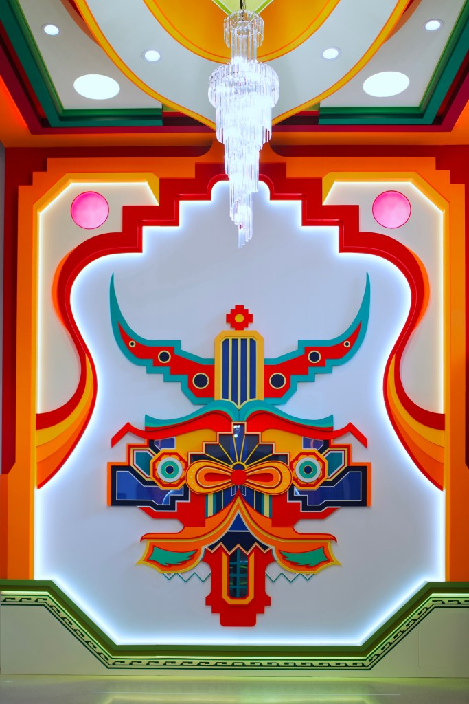 Since the late 1990s, Freddy Mamani has developed a neo-Andean architectural style rooted in the culture of the Aymara, an Indigenous people of the Bolivian Altiplano. For the exhibition, he recreated one of his salones de eventos, colorful and flamboyant, within the Fondation’s new building.